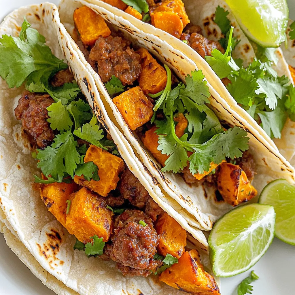 Now, let’s put it all together! Take a tortilla and add a generous scoop of the chorizo and sweet potato mix. Make sure each taco has enough filling. For a nice touch, garnish with fresh cilantro. You can also add lime wedges on the side. Squeeze some lime over the tacos for extra flavor!