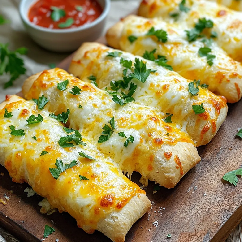 Serving your cheesy garlic breadsticks is fun and easy. Arrange them warm on a wooden board. This gives a nice rustic look. Pair them with a small bowl of marinara sauce for dipping. Not only does it taste great, but it also looks nice on the table. For a finishing touch, sprinkle chopped parsley on top. It adds color and freshness.
