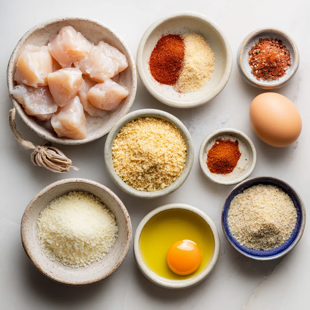 To make these chicken nuggets, I use simple and fresh ingredients. The chicken breast gives a tender bite. I prefer panko breadcrumbs for their extra crunch. Grated Parmesan adds a nice cheesy flavor. Garlic powder and onion powder bring a savory touch. Paprika adds color and a slight kick. Salt and pepper enhance all the flavors. The beaten eggs help the crumbs stick to the chicken.