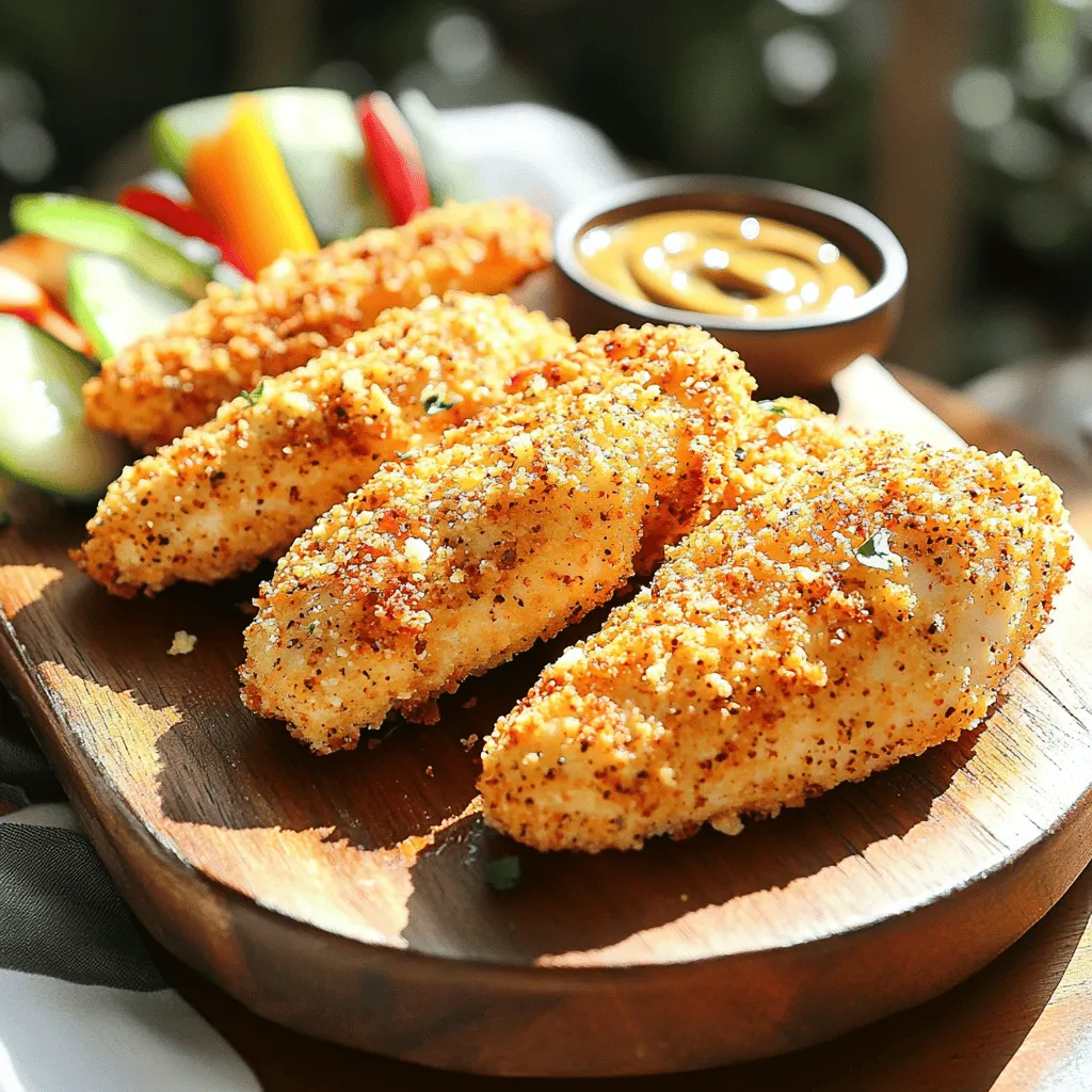![To make tasty air fryer chicken tenders, you need: - 1 lb chicken breast, sliced into strips - 1 cup buttermilk - 1 cup all-purpose flour - 1 cup breadcrumbs (preferably panko for extra crispiness) These main ingredients give you the perfect base. The chicken makes the dish hearty. Buttermilk adds moisture. Flour and breadcrumbs create the crunchy coating. Next, let’s spice things up! You will need: - 1 teaspoon garlic powder - 1 teaspoon onion powder - 1 teaspoon paprika - ½ teaspoon cayenne pepper (optional for extra spice) - Salt and pepper to taste These seasonings bring flavor. Garlic and onion powder add depth. Paprika gives a nice color. Cayenne pepper can add a little kick if you like spice. Want to make your chicken tenders even better? Consider these add-ins: - Fresh herbs like parsley or thyme - Grated Parmesan cheese mixed with breadcrumbs - A splash of hot sauce in the buttermilk These options let you play with flavors. Fresh herbs add brightness. Cheese gives a rich taste. Hot sauce can make them fiery and fun! For the full recipe, check out the Crispy Air Fryer Chicken Tenders. You’ll love how easy it is to whip up this crunchy and juicy treat! Start by marinating the chicken. Take your chicken strips and place them in a large bowl. Pour in the buttermilk until the chicken is fully covered. Cover the bowl with plastic wrap and place it in the fridge. Let the chicken soak for at least 30 minutes to make it tender. If you can wait longer, leave it overnight. This step is key for juicy and flavorful chicken. Next, we need to set up our breading station. In one shallow bowl, mix the flour, garlic powder, onion powder, paprika, cayenne pepper, salt, and pepper. This mix gives a great flavor to the chicken. In another shallow bowl, add your breadcrumbs. I prefer panko for crunch, but any breadcrumbs work. This setup makes breading the chicken easy and fun. Now, it's time to preheat the air fryer. Set it to 400°F (200°C) and let it heat for about 5 minutes. Preheating helps the chicken cook evenly and become crispy. While the air fryer heats up, you can start coating the chicken strips. Follow the breading steps for a delicious finish. For the full recipe, check out the details above. After you coat the chicken, it's time to arrange them in the air fryer. Place the chicken tenders in a single layer. Make sure they do not touch each other. This allows hot air to flow around each piece, giving you that perfect crunch. If you crowd the basket, they may steam instead of fry. Set your air fryer to 400°F (200°C). Cook the chicken tenders for 10 to 12 minutes. This high heat helps create a crispy outside while keeping the inside juicy. You want them golden brown. Use a meat thermometer to check the internal temperature. It should reach 165°F (75°C) for safety. Halfway through cooking, flip the chicken tenders. This step is key for even crispiness. The air fryer cooks from all sides, but flipping helps achieve that perfect golden color. Use tongs for this step to prevent burns. After flipping, spray the top again with a bit of cooking spray for added crunch. {{image_2}} To make your chicken tenders crunchy, use panko breadcrumbs. They add extra texture. Coat each tender well with the flour mix. This step is key for a great crunch. Don't skip the buttermilk soak; it keeps the chicken juicy. Ensure your air fryer is preheated to 400°F. This helps the tenders crisp right away. To stop chicken tenders from sticking, spray the air fryer basket with cooking spray. A light coat goes a long way. Arrange the tenders in a single layer. Avoid overcrowding; it leads to uneven cooking. Flip the chicken halfway through cooking. This helps both sides crisp up nicely. Serve your chicken tenders hot for the best taste. Pair them with sauces like honey mustard or BBQ. Add some fresh veggies or a salad on the side for color. This makes your plate look great and adds healthy crunch. You can find the full recipe to start cooking today! You can easily change the flavor of your chicken tenders. For a spicy kick, add more cayenne pepper or some hot sauce to the buttermilk. This gives the chicken a nice heat. If you prefer mild flavors, skip the cayenne altogether. Instead, add herbs like thyme or rosemary for a fresh taste. You can also mix in some lemon zest for brightness. You can make these chicken tenders gluten-free. Use gluten-free flour instead of all-purpose flour. Also, choose gluten-free breadcrumbs. These swaps keep the crunchy texture while being safe for those with gluten sensitivities. Always check labels to ensure your ingredients are truly gluten-free. While an air fryer is great, you can also bake or pan-fry these tenders. To bake, preheat your oven to 425°F (220°C). Place the tenders on a baking sheet and spray them with cooking spray. Bake for about 15-20 minutes, flipping halfway. For pan-frying, heat oil in a skillet over medium heat. Cook the tenders for about 4-5 minutes on each side until golden brown. Each method gives you a tasty result, just with a different texture. For the complete recipe, check the [Full Recipe]. To check if your chicken tenders are cooked, use a meat thermometer. The inside should reach 165°F (75°C). The outside will be golden and crispy. You can also cut one open. The meat should be white and not pink. Juices should run clear. This ensures your chicken is safe and tasty. Yes, you can prepare these chicken tenders ahead of time. Marinate the chicken and coat it with the breading. Then, store them in the fridge for up to 24 hours. When you're ready, just air fry them. You can also freeze the breaded tenders. When frozen, they last for about three months. Cook them from frozen; just add a few extra minutes to the cooking time. Dipping sauces can make your chicken tenders even better. Some popular choices include: - Honey mustard - Ranch dressing - Barbecue sauce - Ketchup - Buffalo sauce Feel free to mix and match! You can even create your own sauc