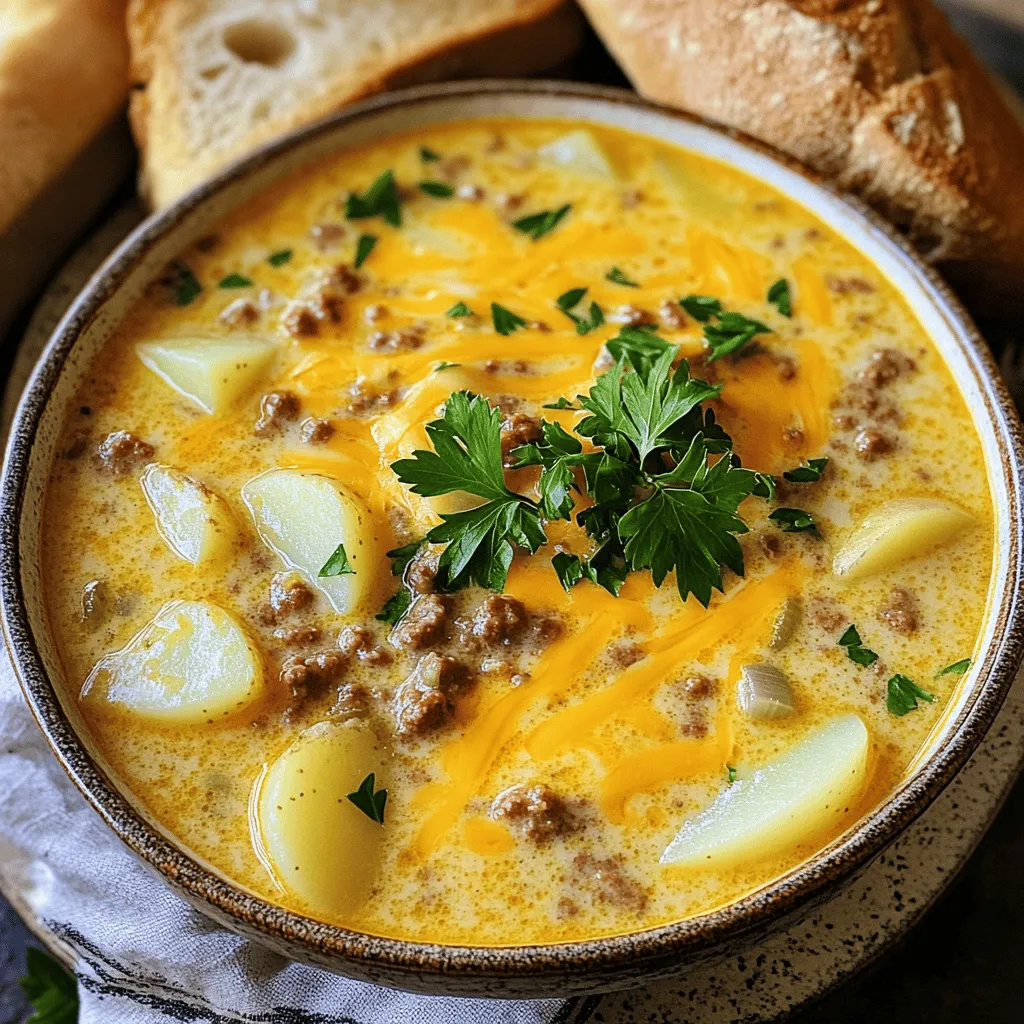 ![To make this soup shine, you need some key ingredients. Here’s what you will need: - 1 lb ground beef - 1 medium onion, chopped - 2 cloves garlic, minced - 3 medium potatoes, peeled and diced - 4 cups beef broth - 1 cup shredded cheddar cheese - 1 cup milk - 1 tablespoon Worcestershire sauce - 1 teaspoon Dijon mustard - 1 teaspoon smoked paprika - Salt and pepper to taste - 2 tablespoons olive oil - Fresh parsley, chopped (for garnish) These ingredients create a rich, meaty flavor. The potatoes add a comforting texture. The cheese makes it creamy and delicious. You can easily customize this soup to fit your taste. Here are some optional ingredients to consider: - Cooked bacon bits for extra crunch - Green onions for a fresh bite - Hot sauce for a spicy kick - Different cheeses like Monterey Jack or Gouda - Frozen vegetables like corn or peas Feel free to mix and match. This makes the soup a fun way to use what you have at home. What type of ground beef should I use? I recommend using 80/20 ground beef. This mix gives good flavor without being too greasy. Can I use other meats? Yes! You can use turkey or chicken for a lighter soup. Just adjust the cooking time. What if I don’t have beef broth? You can use chicken or vegetable broth. This will still give the soup depth and flavor. Is there a dairy-free option? Absolutely! Use coconut milk or almond milk for a dairy-free version. Just make sure to adjust for taste. For the complete recipe, check out the [Full Recipe]. To make this cheeseburger soup, start with a large pot. Heat the olive oil over medium heat. Add the chopped onion and minced garlic. Sauté them until the onions look clear. This step adds great flavor. Next, add the ground beef. Use a wooden spoon to break it up. Cook until it turns brown and is no longer pink, about 5-7 minutes. If there’s too much fat, drain it. Now, stir in the diced potatoes and beef broth. Add the Worcestershire sauce, Dijon mustard, smoked paprika, salt, and pepper. Bring everything to a boil. Lower the heat and let it simmer. Cover the pot and cook for 15-20 minutes. The potatoes should be tender by now. Once cooked, add the milk and shredded cheddar cheese. Stir until the cheese melts. This makes the soup creamy. Taste it and adjust the seasoning if needed. Remove the pot from heat. Let it cool for a few minutes before serving. Browning the beef well is key for rich flavor. Use a wide pot to give the beef space. Don’t overcrowd the pan. If necessary, cook in batches. Stir only a few times to let it brown. This helps to develop a nice crust. Keep the heat at medium. Too high can burn the meat. The total cooking time is about 40 minutes. This includes 10 minutes for prep and 30 minutes for cooking. If your potatoes are larger, they may need extra time. Check for doneness by piercing with a fork. If you want a thicker soup, let it simmer a bit longer. For a thinner soup, add more broth or milk. Always adjust to your taste and preference. For the full recipe, please refer to the [Full Recipe]. To make your cheeseburger soup truly shine, use fresh ingredients. Fresh herbs, like parsley, add bright notes. Smoked paprika brings a warm, smoky taste. For extra depth, try adding a splash of hot sauce. This gives your soup a mild kick without overpowering the main flavors. Don't skip the Worcestershire sauce; it adds umami richness. You can also experiment with different cheeses. A mix of cheddar and Monterey Jack creates a delightful melt. One mistake is overcooking the potatoes. You want them tender, not mushy. If you add them too early, they may break apart. Another common error is using low-quality beef. Choose ground beef with a good fat content for flavor. Avoid adding too much milk too fast. This can lead to curdling. Instead, add it slowly for a smooth finish. Finally, always taste your soup before serving. Adjust the salt and pepper as needed to enhance the flavors. For a creamy texture, start with whole milk or half-and-half. This gives a rich base without being too heavy. Stir in cheese slowly, allowing it to melt evenly. If your soup is too thick, add a bit more broth or milk to loosen it. Blending a portion of the soup can also help. Use an immersion blender for a smooth consistency. Just remember to leave some chunks for that classic cheeseburger feel. For the full recipe, check here: [Full Recipe]. {{image_2}} You can easily make a vegetarian cheeseburger soup. Start by swapping the ground beef with plant-based meat or lentils. Use vegetable broth instead of beef broth. Add extra veggies like bell peppers and corn for texture and flavor. You can also add a splash of soy sauce for depth. This version keeps all the comforting elements of the original. To make this soup gluten-free, choose gluten-free Worcestershire sauce. Use a gluten-free flour blend to thicken the soup. You can also skip the thickening step and enjoy a lighter broth. Ensure all your toppings, like cheese and bread, are gluten-free too. This way, everyone can enjoy a bowl without worries. Toppings can elevate your cheeseburger soup. Try adding crispy bacon bits or jalapeños for a spicy kick. Sour cream or Greek yogurt adds creaminess. Chopped green onions give a fresh touch. You can even add crumbled tortilla chips for crunch. Feel free to mix and match based on your taste. The Full Recipe gives you a great base to start from! Store leftover cheeseburger soup in an airtight container. Let the soup cool first. Then, transfer it to the container. Make sure to leave some space at the top. This allows the soup to expand when frozen. You can keep it in the fridge for up to three days. To reheat, pour the soup into a pot. Heat it over medium-low heat. Stir often and heat until warm. You can also use the microwave. Pour the soup into a microwave-safe bowl. Heat it in short bursts, stirring in between. This way, the soup heats evenly. To freeze cheeseburger soup, use freezer-safe containers. Divide the soup into portions for ea