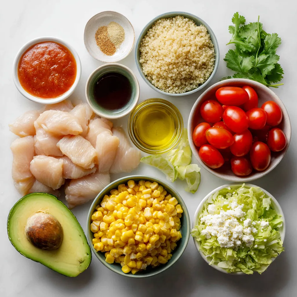These ingredients give the bowl its tasty flavor and healthy boost. Starting with quinoa keeps the base nutritious and filling. Chicken adds protein, while buffalo sauce brings a spicy kick. Fresh veggies like tomatoes and avocado add color and texture. Lastly, feta cheese and herbs give it a nice finish.