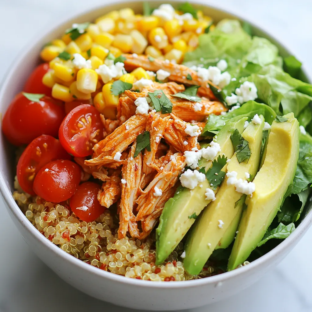Now it’s time to build your power bowl! Start with a base of fluffy quinoa. Top it with the shredded buffalo chicken. Then, add halved cherry tomatoes, cooked corn, sliced avocado, and shredded romaine lettuce. Each layer brings a burst of flavor and texture.