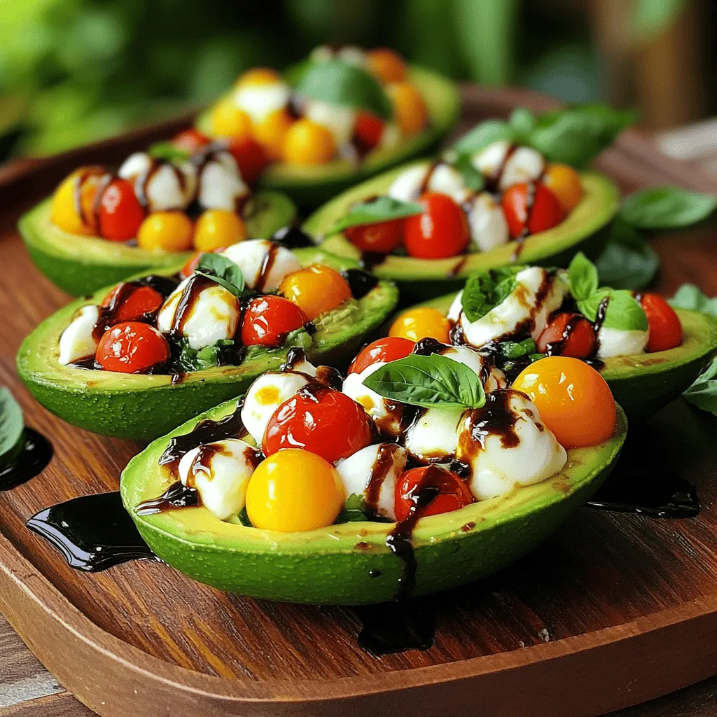 Presentation is key to making your dish stand out. Place the stuffed avocados on a bright platter to catch the eye. Garnish them with extra basil leaves for a pop of color. A light drizzle of balsamic glaze adds shine and elegance. For added flair, sprinkle some sea salt on top. This enhances the flavors while making your dish look gourmet.