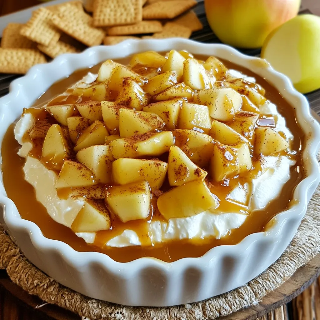When serving, choose a clear dish to show off the layers. Start with the cream cheese layer at the bottom. Then, pour on the caramel sauce. Lastly, top with the spiced apples. Drizzle extra caramel on top for a touch of shine. To make it even more inviting, serve with a variety of dippers. Place graham crackers, apple slices, and vanilla wafers around the dip. This adds color and texture to your presentation.