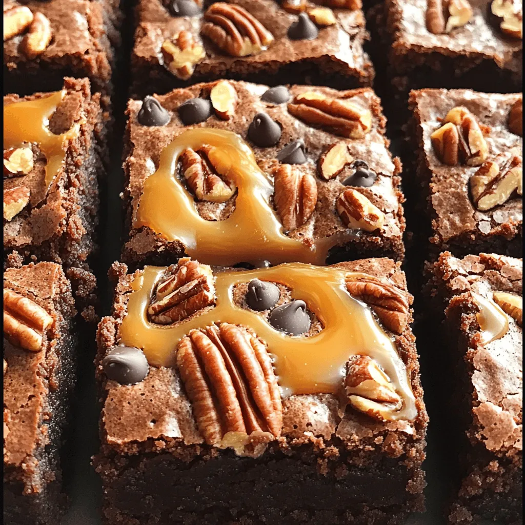 The flour and cocoa powder form the base for the brownies. Baking powder helps them rise. Salt balances the sweetness and enhances flavor. Chopped pecans add crunch and nutty taste. Caramel sauce provides that sticky, sweet layer. Finally, chocolate chips give pockets of melted chocolate in every bite.