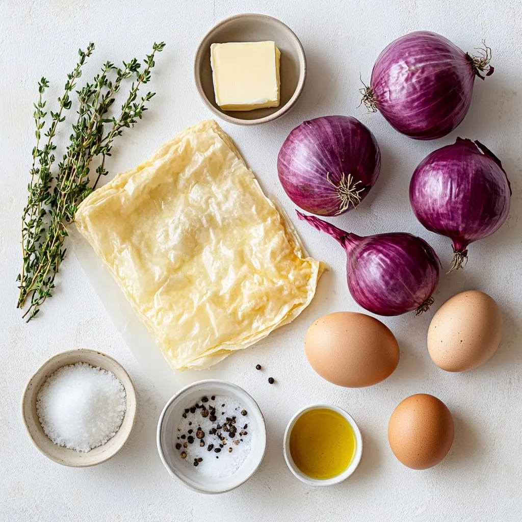 The main ingredients of this tart bring rich flavors together. Puff pastry forms the base. It is flaky and light. Onions add sweetness when cooked well. I like to use three large onions for depth of flavor. Olive oil and butter provide a smooth cooking fat. Fresh thyme gives a herby note that pairs well with cheese. Gruyère cheese is the star, adding creamy, nutty goodness. Eggs and heavy cream create a rich custard.