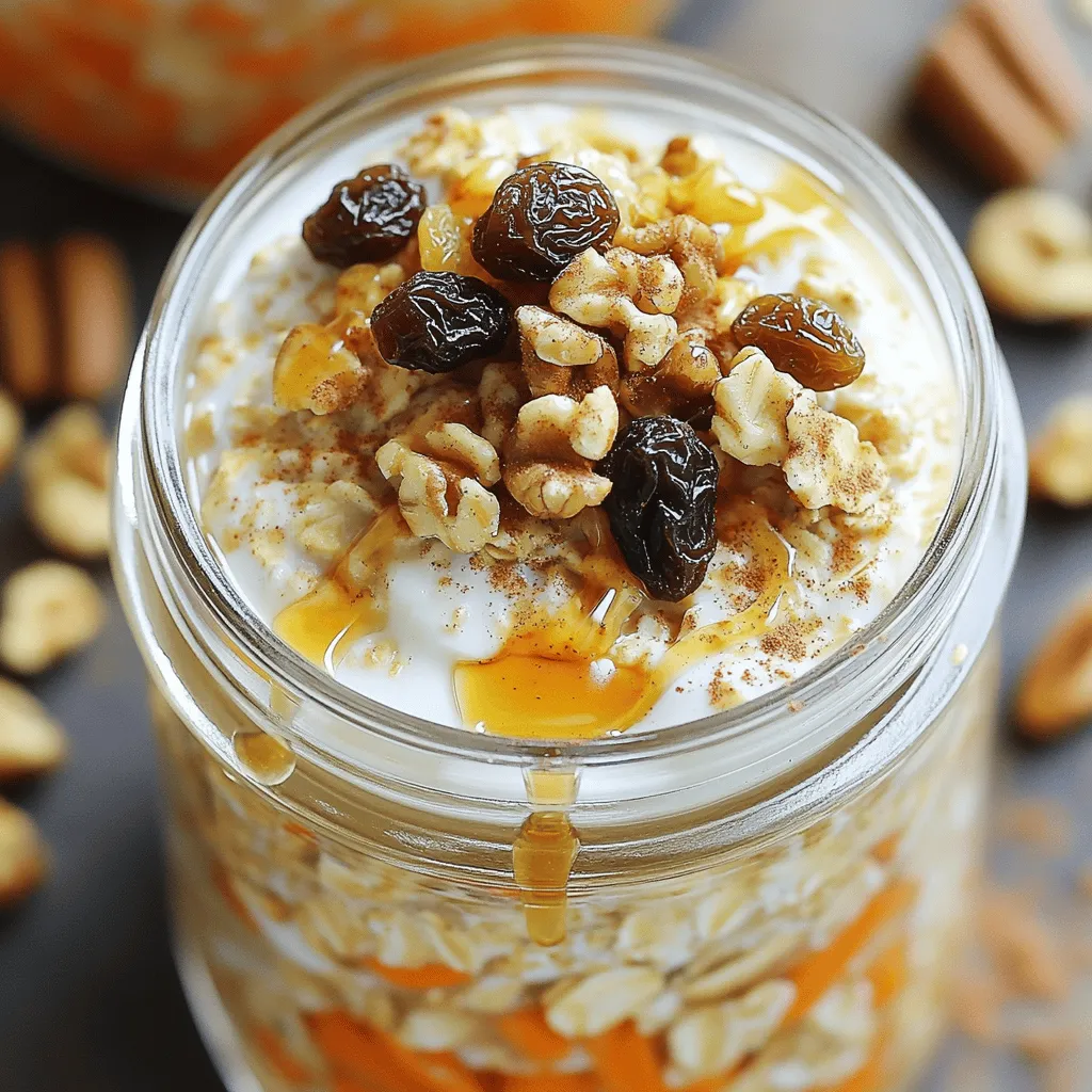 First, grab a medium bowl or jar. Add 1 cup of rolled oats and 1 cup of almond milk. Stir well. Make sure the oats soak up the milk. Next, add in the finely grated carrot. If you want creaminess, toss in ¼ cup of Greek yogurt. Sweeten with 2 tablespoons of maple syrup or honey. Then, mix in ½ teaspoon of vanilla extract, ½ teaspoon of ground cinnamon, and ¼ teaspoon of ground nutmeg. Don’t forget a pinch of salt! Finally, fold in ¼ cup of raisins and 2 tablespoons of chopped walnuts for some added crunch.