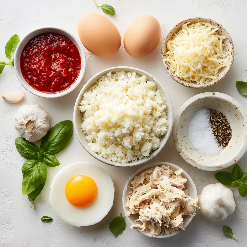- In a large mixing bowl, combine the cauliflower rice, mozzarella cheese, Parmesan cheese, egg, minced garlic, oregano, salt, and pepper. Mix well until everything is thoroughly combined.
