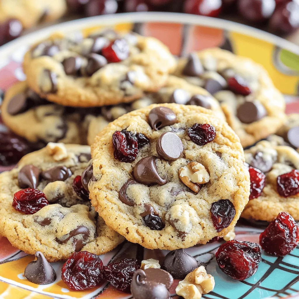 ![- 1 cup unsalted butter, softened - 1 cup brown sugar, packed - ½ cup granulated sugar - 2 large eggs - 1 teaspoon vanilla extract - 2 ½ cups all-purpose flour - 1 teaspoon baking soda - ½ teaspoon salt - 1 cup dark chocolate chips - 1 cup dried cherries, roughly chopped - ½ cup chopped walnuts (optional) To make these cookies, you need a few key items. I recommend using unsalted butter for a balanced flavor. Brown sugar gives cookies a lovely chew. The granulated sugar adds sweetness. Two eggs bind everything together and help with rise. Flour is your base, and baking soda helps the cookies rise and stay soft. Salt enhances all the flavors. Dark chocolate chips provide a rich taste. Dried cherries add a sweet and tart burst. If you like nuts, walnuts add a nice crunch. - Different types of chocolate (milk, white) - Flavor extract variations (almond, orange) - Additional nuts or seeds You can switch up the chocolate if you want. Milk or white chocolate can make the cookies sweeter. Also, try adding a splash of almond or orange extract. This gives a unique twist. You can also add other nuts or seeds for extra texture. - Mixing bowls - Baking sheets - Parchment paper - Cookie scoop or tablespoon Having the right tools is key. Mixing bowls help you combine ingredients easily. Baking sheets hold the cookies while they bake. Parchment paper keeps them from sticking. A cookie scoop or tablespoon makes it simple to shape the dough. With these ingredients and tools ready, you’re set to make cherry chocolate chewy cookies that are sure to impress! For the full recipe, check out the [Full Recipe]. - Preheat oven to 350°F (175°C) - Line baking sheets with parchment paper Start by preheating your oven. This step ensures even baking. While it warms up, grab your baking sheets and line them with parchment paper. This helps the cookies not stick and makes cleanup easy. - Cream together butter, brown sugar, granulated sugar - Add eggs one at a time and mix well - Stir in the vanilla extract In a big bowl, cream the softened butter, brown sugar, and granulated sugar. Mix until it’s light and fluffy. Next, add the eggs, one egg at a time. Be sure to mix well after each egg. This helps the batter become smooth. Finally, stir in the vanilla extract for an extra kick of flavor. - Whisk flour, baking soda, and salt - Gradually add to the wet mixture In another bowl, whisk together the flour, baking soda, and salt. This step is key for even distribution. Gradually add this mix to the wet ingredients. Stir until just combined. You don’t want to overmix, as this can make your cookies tough. - Fold in dark chocolate chips, dried cherries, and walnuts - Drop rounded balls onto the baking sheet Now, fold in the dark chocolate chips, dried cherries, and walnuts if you’re using them. This adds a great texture and flavor. Using a cookie scoop or tablespoon, drop rounded balls of dough onto the prepared baking sheet. Make sure to leave space between each ball to allow for spreading. - Bake for 10-12 minutes until lightly golden - Cool on the baking sheet for 5 minutes before transferring to a wire rack Pop the baking sheet in the oven. Bake for 10-12 minutes until the edges are lightly golden. The centers may look soft but will firm up as they cool. After baking, let the cookies cool on the baking sheet for 5 minutes. Then, transfer them to a wire rack to cool completely. This helps keep them chewy and delicious. Enjoy your Cherry Chocolate Chewy Cookies! For the complete details, check the Full Recipe. To get that perfect chewy texture, start with your butter. It should be soft but not melted. If your butter is too hard, your cookies may end up dry. Leave it out at room temperature for about 30 minutes before you begin. This helps mix it well with the sugars. Next, do not overmix your dough. Once you add the dry ingredients, mix until just combined. Overmixing can lead to tough cookies. Remember, a little flour showing is okay! Using an oven thermometer is key for great results. Ovens can be off by a lot. An accurate temperature helps your cookies bake evenly. If your oven runs hot or cold, adjust the time or temperature accordingly. Place your baking sheet on the middle rack of the oven. This ensures even heat all around the cookies. It helps them rise nicely and bake without burning on the bottom. For a fun touch, arrange your cookies on a colorful plate. This makes them pop and look more inviting. You can sprinkle a few extra cherries and chocolate chips on top. It adds a nice look and hints at the yummy flavors inside. Enjoying them with a glass of cold milk makes it even better! For the full recipe, check out the detailed instructions above. {{image_2}} You can easily change the flavor of your cherry chocolate chewy cookies. Here are two fun ideas: - Almond cherry chocolate cookies: Add 1 teaspoon of almond extract to the wet mix. The almond flavor pairs well with cherries and chocolate. - Orange zest cherry chocolate cookies: Grate the zest of one orange into the dough. This brightens the flavor and adds a fresh twist. If you have special diet needs, you can still enjoy these cookies. Here are some ways to adjust the recipe: - Gluten-free options using almond flour: Swap out all-purpose flour for almond flour. The cookies will be soft and nutty. - Vegan modifications with egg substitutes: Use ¼ cup of applesauce or a flax egg instead of eggs. Mix 1 tablespoon of ground flaxseed with 2.5 tablespoons of water for each egg. You can change the size and shape of your cookies to fit your needs: - Making mini cookies: Use a smaller cookie scoop for bite-sized treats. Bake for about 8-10 minutes. - Shaping into bars or bites: Press the dough into a lined baking dish. Bake for 15-20 minutes. Cut into bars once cooled for easy serving. For detailed instructions, check the Full Recipe. To keep your cookies fresh, store them in an airtight container. This helps retain their chewy texture. They stay fresh fo