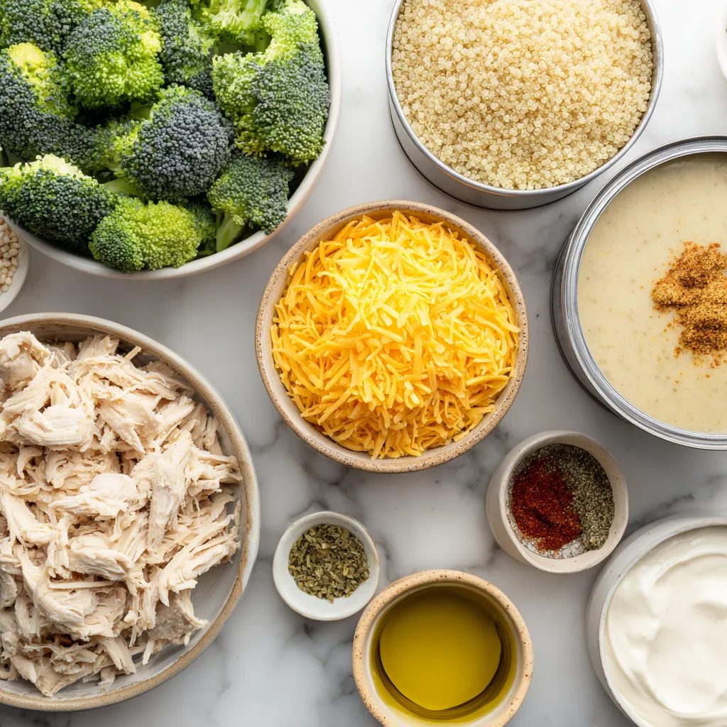 These ingredients come together to create a warm, cheesy, and satisfying meal. The chicken adds protein, while the broccoli gives vitamins and color. Quinoa or rice makes it filling, and the cheese binds it all in a creamy mix. You can use frozen broccoli for ease, or fresh for a crunchier bite. The cream of mushroom soup adds depth, and Greek yogurt keeps it moist. Garlic and onion powders boost the flavor without extra work. Seasoning with salt, pepper, and paprika gives it a nice kick. If you want a crunchy topping, add breadcrumbs mixed with olive oil. This combination makes for a cozy meal that everyone will love.