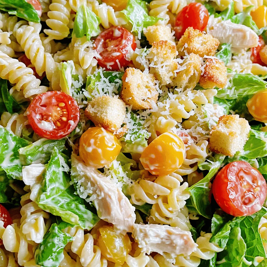 When I create Chicken Caesar Pasta Salad, I focus on fresh, simple ingredients. I start with fusilli pasta. Its spiral shape holds the dressing well. Next, I use cooked chicken breast, diced into bite-sized pieces. This adds protein and flavor. For crunch, I chop up romaine lettuce. The bright green color makes the salad pop. I also toss in cherry tomatoes, halved, to add sweetness.