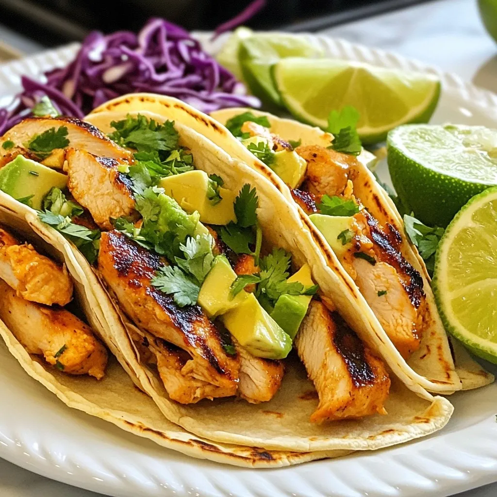 - To assemble the tacos, place a few strips of grilled chicken into each tortilla. Top with shredded cabbage, fresh cilantro, and avocado slices.