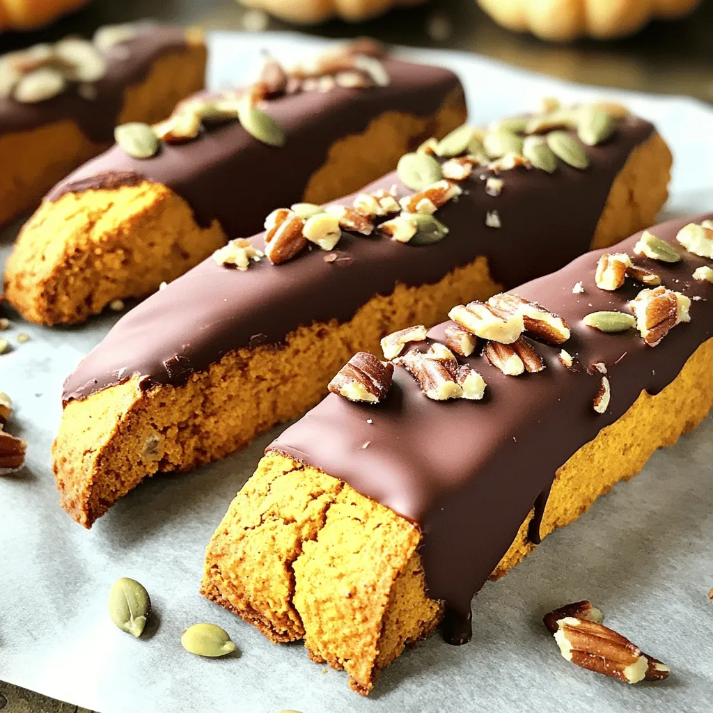 ![The right ingredients make all the difference in creating tasty Chocolate Dipped Pumpkin Biscotti. Here’s what you need to gather for this scrumptious treat: - 1 cup canned pumpkin puree - ¾ cup sugar - ½ cup vegetable oil - 2 large eggs - 2 teaspoons vanilla extract - 2 ½ cups all-purpose flour - 1 teaspoon baking powder - ½ teaspoon baking soda - 1 teaspoon ground cinnamon - ½ teaspoon ground nutmeg - ¼ teaspoon ground ginger - ½ teaspoon salt - 1 cup semi-sweet chocolate chips - Optional: Chopped nuts or pumpkin seeds for topping Canned pumpkin puree gives the biscotti a rich flavor and moisture. Sugar adds sweetness and helps create a nice crust. The vegetable oil keeps the biscotti tender. Eggs bind everything together and add structure. Vanilla extract brings warmth and depth. All-purpose flour provides the base, while baking powder and baking soda help the dough rise. Ground cinnamon, nutmeg, and ginger create that cozy fall flavor. Salt balances the sweetness. Semi-sweet chocolate chips provide the perfect chocolatey finish. You can add chopped nuts or pumpkin seeds for extra crunch if you like. Each ingredient plays a key role in making these biscotti a delightful treat. For the full recipe, check the details available. Start by preheating your oven to 350°F (175°C). This step is key to ensure even baking. Line a baking sheet with parchment paper. This helps prevent sticking and makes cleanup easy. In a large bowl, combine 1 cup of canned pumpkin puree, ¾ cup of sugar, ½ cup of vegetable oil, 2 large eggs, and 2 teaspoons of vanilla extract. Whisk these ingredients together until smooth. This mixture will bring moisture and flavor to your biscotti. In another bowl, mix 2 ½ cups of all-purpose flour, 1 teaspoon of baking powder, ½ teaspoon of baking soda, 1 teaspoon of ground cinnamon, ½ teaspoon of ground nutmeg, ¼ teaspoon of ground ginger, and ½ teaspoon of salt. Whisk these dry ingredients together. This blend gives the biscotti structure and spice. Gradually add the dry ingredients to the wet mixture. Stir gently until you see no dry flour. Do not overmix! Divide the dough into two equal parts. Shape each half into a log about 12 inches long and 3 inches wide. Place these logs on your prepared baking sheet with space in between. Bake the logs in your preheated oven for 25-30 minutes. They should look golden and firm when done. After baking, let them cool for about 15 minutes. This cooling time makes slicing easier. Once cooled, take a serrated knife and slice each log diagonally into 1-inch thick slices. Arrange the slices cut-side down on the baking sheet. Return them to the oven for another 15-20 minutes. This second bake makes them crisp and delightful. While the biscotti cool, melt 1 cup of semi-sweet chocolate chips. Use a microwave-safe bowl and heat in 30-second bursts, stirring in between. Once smooth, dip one end of each biscotti into the melted chocolate. Let the excess drip off. If you like, sprinkle chopped nuts or pumpkin seeds on top while the chocolate is still wet. Finally, place the dipped biscotti on parchment paper to let the chocolate set. For the full recipe details, check out the [Full Recipe]. To get the right texture, use fresh canned pumpkin puree. This makes your biscotti moist and flavorful. Mix the wet and dry ingredients until just combined. Overmixing can lead to tough biscotti. To achieve crispiness, slice the logs thinly. A serrated knife works best for clean cuts. Bake the sliced biscotti twice for that satisfying crunch. Store your biscotti in an airtight container. This keeps them fresh and tasty. They last up to two weeks at room temperature. You can also freeze them for longer storage. Just place them in a freezer bag, and they will be good for three months. When ready, thaw them at room temperature. Pair these biscotti with coffee or tea. They make a lovely treat for afternoon breaks. You can also gift them to friends. Put them in a pretty box, and they will love the thought. For extra flair, add a ribbon to the box. Enjoy sharing your delicious creation with others! {{image_2}} You can make these biscotti gluten-free! Just swap the all-purpose flour with a gluten-free blend. Look for one that works well in baking. You can use 2 ½ cups of this blend. Make sure it has xanthan gum in it, as it helps with texture. This swap keeps the taste and crunch you love. Want to spice things up? You can add more flavor! Try one teaspoon of pumpkin spice for a warm touch. You might also like to add a splash of almond extract or maple extract for a twist. As for the chocolate, you can use white chocolate or dark chocolate instead of semi-sweet. Each choice gives a new taste to your biscotti. If you need a nut-free version, that's easy! Just skip any nuts or seeds you might want to add on top. You can also use sunflower seeds or pumpkin seeds if you want a crunch without nuts. Look for chocolate that is nut-free, too. Enjoy the same great biscotti without worry! You can get a handy printable recipe card for chocolate dipped pumpkin biscotti. This card helps you keep all your ingredients and steps in one place. You can print it out or save it on your phone. This makes cooking easy and fun! Using the recipe card is simple. First, gather all your ingredients. The card lists everything you need. Next, follow the steps on the card. It gives you clear instructions, so you won’t miss any steps. You can check off each step as you go. This keeps you on track and makes cooking less stressful. Having a printable version offers many benefits. It allows you to save time while cooking. You won’t need to search your phone or computer for the recipe. Plus, you can jot down notes or changes for next time. If you like to cook with friends, a printed card helps everyone see the steps together. It's a fun way to share the joy of cooking! Store your biscotti in an airtight container. This keeps them fresh and crisp. You can also use wax paper between
