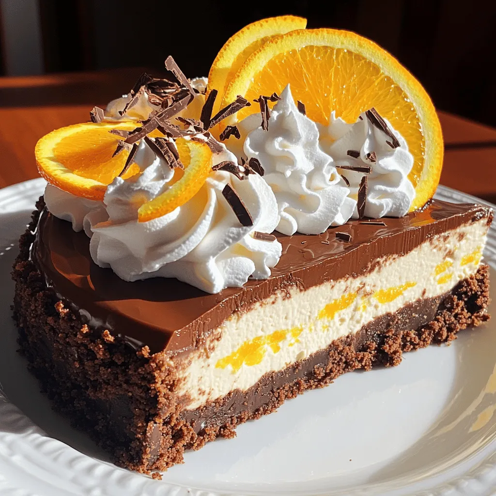 ![- 1 ½ cups chocolate cookie crumbs - 16 oz cream cheese, softened - ¼ cup fresh orange juice - 1 cup semi-sweet chocolate chips These main ingredients create the base for your delicious cheesecake. The chocolate cookie crumbs form a tasty crust, while the cream cheese gives it a rich texture. Fresh orange juice adds a bright, zesty flavor that complements the chocolate. Semi-sweet chocolate chips enhance the chocolatey taste, making every bite delightful. - 1 cup whipped cream - Orange slices - Chocolate shavings Using optional garnishes makes your cheesecake look and taste even better. Whipped cream adds a light touch. Orange slices give a fresh pop of color. Chocolate shavings add a nice, elegant finish. Feel free to mix and match these garnishes to make the dessert your own. - 9-inch springform pan - Electric mixer - Microwave or double boiler Having the right equipment is key for this recipe. A 9-inch springform pan helps you easily remove the cheesecake after baking. An electric mixer makes blending the cream cheese quick and easy. Use a microwave or double boiler to melt chocolate smoothly without burning it. These tools will ensure your cheesecake turns out perfectly. For the full recipe, check out [Full Recipe]. Set your oven to 325°F (160°C). Preheating helps the cheesecake cook evenly. In a medium bowl, mix 1 ½ cups of chocolate cookie crumbs with ½ cup of melted unsalted butter. Use a fork to blend until the crumbs look wet. Press this mixture firmly into the bottom of a 9-inch springform pan. Bake for 10 minutes. Let it cool before adding the filling. In a large mixing bowl, beat 16 oz of softened cream cheese with ½ cup of granulated sugar. Use an electric mixer for a smooth and creamy texture. This step is key for a rich filling. Add 2 large eggs to the cream cheese mix, one at a time. Mix well after each egg. Then, add 1 teaspoon of vanilla extract, the zest of 1 large orange, and ¼ cup of fresh orange juice. Blend until smooth. In a microwave or double boiler, melt 1 cup of semi-sweet chocolate chips. If using the microwave, heat in short bursts to avoid burning. Stir until smooth and let it cool slightly. Fold the melted chocolate into the cream cheese mixture. Pour the cheesecake filling over the cooled crust. Smooth the top using a spatula. Bake for 45-50 minutes or until the edges are set, and the center jiggles slightly. Turn off the oven and crack the door open. Let the cheesecake cool inside for about an hour. Refrigerate for at least 4 hours or overnight for best results. You can find the complete guide to this delicious recipe in the Full Recipe section. Enjoy your baking adventure! To prevent cracks in your cheesecake, keep the oven door closed. Sudden temperature changes can cause cracks. Also, bake your cheesecake in a water bath. This keeps the heat even and moist. Wrap the springform pan in foil to avoid water leaks. This simple trick helps create a smooth surface. Using room temperature ingredients is key for a smooth cheesecake. Cold cream cheese can lead to lumps. Let the cream cheese sit out for about 30 minutes before mixing. This simple step makes a big difference. Warm eggs blend better too, so let them sit as well. For the best taste, serve your cheesecake with fresh whipped cream. It adds lightness and pairs well with chocolate and orange. You can also add orange slices and chocolate shavings on top. These garnishes make your dessert look beautiful and inviting. Enjoy your delightful cheesecake with a cup of coffee or tea for a perfect treat. {{image_2}} You can change up the flavors in your cheesecake. If you like berries, use raspberry instead of orange. Mix in lemon juice and zest for a fresh twist. You can also try mango or coconut for a tropical vibe. Each flavor adds its own touch and keeps things exciting. The crust can be fun to play with too. Instead of chocolate cookie crumbs, use graham crackers. For a gluten-free option, almond flour works well. You could even use crushed nuts for a crunchy base. Each choice gives your cheesecake a new taste and texture. If you want to skip baking, a no-bake cheesecake is easy. Start by mixing cream cheese and sugar until smooth. Then, fold in whipped cream for a light texture. Instead of baking, chill it in the fridge for at least four hours. This gives it a creamy, soft feel. You can still use the same toppings for a delicious finish. For more details, check the Full Recipe. After you make the Chocolate Orange Cheesecake, you need to store it right. I suggest placing it in the fridge. Use a tight cover or plastic wrap. This keeps it fresh and tasty. Leftovers can last about five days in the fridge. Want to save some for later? You can freeze the cheesecake! Cut it into slices first. Wrap each slice in plastic wrap, then place them in a freezer bag. This way, you can enjoy a slice anytime. It stays good in the freezer for about three months. How long will your cheesecake last? In the fridge, it lasts about five days. If you freeze it, you can keep it for about three months. Always check for signs of spoilage, like off smells or discoloration. Enjoy your delightful dessert! For the full recipe, see the section above. To get a creamy texture, use room temperature cream cheese. Cold cream cheese will not mix well. Blend the cream cheese and sugar until you see no lumps. Mix slowly, so you do not add too much air. Overmixing can make the cheesecake dense. Yes, you can use mascarpone or ricotta cheese. These will change the taste and texture a bit. For a lighter option, try Greek yogurt. It will add a nice tang, but it may not be as rich. If your cheesecake cracks, don’t worry! You can cover it with whipped cream or chocolate ganache. To prevent cracks, cool your cheesecake slowly. Leave it in the oven with the door slightly open for an hour after baking. This helps avoid sudden temperature changes. Check for a slight jiggle in the center. The edges should be set, but the middle can move a bit. I