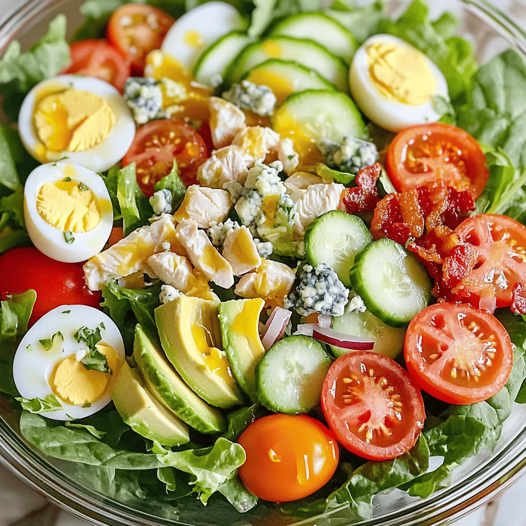 ![Classic Cobb Salad is fresh and filling. Here are the key ingredients you need: - 4 cups mixed salad greens (romaine, arugula, and spinach) - 2 large eggs, hard boiled and sliced - 1 cup cooked chicken breast, diced - 1 large avocado, diced - 1 cup cherry tomatoes, halved - ½ cup crumbled blue cheese - ¼ cup cooked bacon bits (optional) - ½ cup cucumber, sliced - ¼ cup red onion, thinly sliced These ingredients create a colorful and tasty dish. The greens provide a crisp base. The chicken adds protein, while the eggs give richness. Avocado brings creaminess, and tomatoes add sweetness. Blue cheese gives a bold flavor, and bacon adds a savory crunch. You can customize your Cobb Salad to fit your taste. Here are some optional ingredients: - Chopped nuts for extra crunch - Fresh herbs like parsley or cilantro for brightness - Bell peppers for extra color and sweetness - Different cheeses like feta or goat cheese Feel free to mix and match. This makes the salad your own. A good dressing ties everything together. For a classic Cobb Salad dressing, use: - ¼ cup olive oil - 2 tablespoons red wine vinegar (or apple cider vinegar for a twist) - 1 teaspoon Dijon mustard - Salt and pepper to taste This dressing is simple yet full of flavor. It adds a tangy brightness to the salad. You can adjust the vinegar for more zest or the mustard for a kick. For a creamier option, try adding yogurt or sour cream. Remember, you can find the full recipe for this delicious salad [Full Recipe]. Enjoy crafting your perfect Cobb Salad! To start, you need to prep your ingredients. First, hard boil the eggs. Place them in a pot of water. Bring it to a boil, then let it simmer for 10 minutes. Next, cool the eggs under cold water. This helps them peel easily. Once cooled, peel and slice the eggs. Now, take your mixed salad greens. I like to use romaine, arugula, and spinach. Wash them well and spin them dry. This makes the salad crisp and fresh. Dice the cooked chicken breast and avocado. Halve the cherry tomatoes and slice the cucumber. For the red onion, slice it thinly. In a large bowl, start with the mixed greens as your base. This gives your salad a nice, fresh look. Next, arrange the diced chicken, diced avocado, halved cherry tomatoes, and cucumber slices in neat rows over the greens. Now it’s time for the blue cheese. Crumble it on top for a salty kick. If you like bacon, sprinkle the bacon bits over the salad. Finally, add the thinly sliced red onion. This adds a nice crunch and flavor. For the dressing, grab a separate bowl. Whisk together olive oil, red wine vinegar, and Dijon mustard. Add salt and pepper to taste. This will give your salad a zesty flavor. Once your dressing is ready, drizzle it over the arranged salad just before serving. This keeps the greens fresh and crisp. If you want, you can gently toss the salad for a mixed flavor. Or, serve it as is for a beautiful presentation. For the complete steps and tips, check out the Full Recipe. To hard boil eggs, start with fresh eggs. Place them in a pot and cover them with cold water. Bring the water to a boil over high heat. Once boiling, turn off the heat and cover the pot. Let the eggs sit for about 12 minutes. After that, cool them in ice water for a few minutes. Then, crack and peel the shells. This method helps prevent green rings around the yolk and keeps the eggs tender. Fresh ingredients make the Cobb salad shine. When picking salad greens, look for vibrant colors and no wilted leaves. For tomatoes, choose firm ones with smooth skin. Avocados should be slightly soft to the touch but not mushy. The chicken should have a pleasant smell, and bacon should be crisp. Always check the sell-by dates on packaged items like cheese and dressings. For a beautiful Cobb salad, presentation matters. Use a large clear bowl to show off the colorful layers. You can also serve the salad on individual plates for a nice touch. Arrange the ingredients in neat rows for a stunning look. Garnish with extra blue cheese and a sprig of fresh herb for added appeal. This makes your salad not just tasty but also a feast for the eyes. {{image_2}} You can easily make a Cobb salad vegetarian or vegan. For a vegetarian dish, skip the chicken and bacon. Instead, add protein-rich ingredients like chickpeas or quinoa. You can also use feta or a dairy-free cheese. For a vegan option, replace eggs with sliced avocado or roasted chickpeas. Use a vegan dressing made with tahini or avocado oil. These swaps keep the salad tasty and filling. If you want to switch up proteins, there are many options. Grilled shrimp or salmon add a nice twist. You can also use turkey or tofu for a different flavor. For a meat-free option, try lentils or black beans. Each protein brings its unique taste and texture to the classic Cobb salad. Dressings make the salad come alive. While a classic vinaigrette works well, you can explore fun flavors. Try a spicy chipotle dressing for a kick or a creamy avocado dressing for richness. Adding toppings like roasted nuts, seeds, or fresh herbs can enhance the taste. You can even add fruits like apples or berries for a sweet touch. These twists keep the salad fresh and exciting. For the full recipe, check the Crispy Cobb Salad Delight section above. To keep your Cobb salad fresh, first, separate the dressing from the salad. This keeps the greens crisp and prevents sogginess. Place any leftover salad in an airtight container. Make sure to cover it tightly. Store it in the fridge for up to three days. If you have leftover dressing, store it in a small jar. It can last up to a week in the refrigerator. I recommend using glass containers for storing salads. Glass keeps food fresh and is easy to clean. Choose containers that have tight-fitting lids. This helps keep your Cobb salad safe from air and moisture. If you prefer plastic, look for BPA-free options. These are safe and can save weight in your lunch bag. If you have leftover chicken from your Cobb salad, rehea