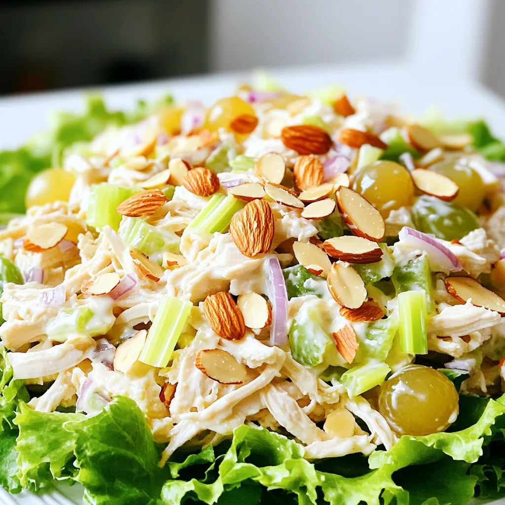 Store your chicken salad in the fridge. Use an airtight container to keep it fresh. It lasts about three to four days. For serving, scoop it onto fresh lettuce leaves. You can also make sandwiches or wraps. If you have guests, use a platter for a nice display. For a pop of color, garnish with sliced almonds.