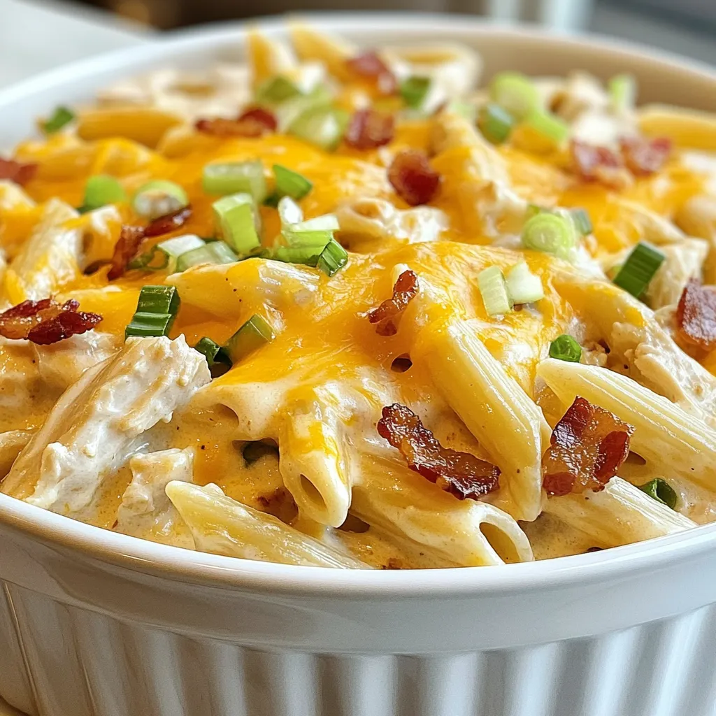 - Plate the Crack Chicken Penne and garnish with sliced green onions and crispy bacon bits if desired.