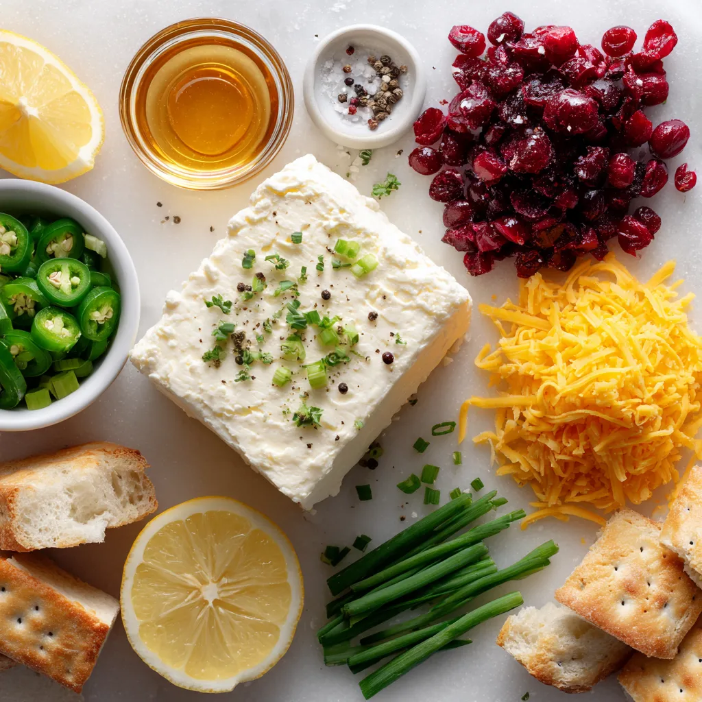 The main ingredients form the base of this dip. Cream cheese gives it a rich and smooth texture. Fresh cranberries add a tartness that balances the spice. The jalapeño brings heat, while the green onions offer a fresh crunch. Sharp cheddar cheese adds depth and flavor.