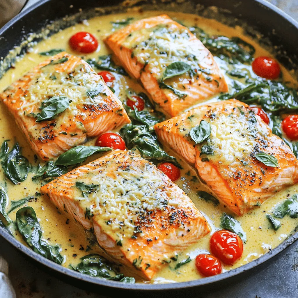 Gather these ingredients before you start cooking. Fresh ingredients make a big difference. The salmon fillets should be bright and firm. Choose ripe cherry tomatoes for sweetness. Garlic adds depth, while the spinach gives a nice color. Heavy cream and Parmesan cheese create that rich, creamy sauce. Italian seasoning brings warmth and balance. Salt and pepper enhance all the flavors. Don’t forget fresh basil for garnish. It adds a pop of color and fresh taste!
