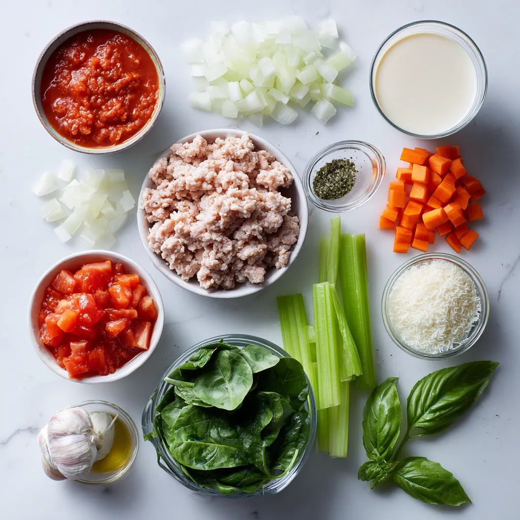 The main ingredients in this soup create a flavorful base. Ground chicken adds protein and a light texture. The diced onion and minced garlic bring depth and aroma. Carrots and celery add sweetness and crunch. The diced tomatoes provide acidity, while chicken broth makes it hearty.