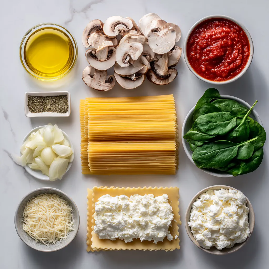 Main Ingredients for Creamy Spinach Mushroom Lasagna