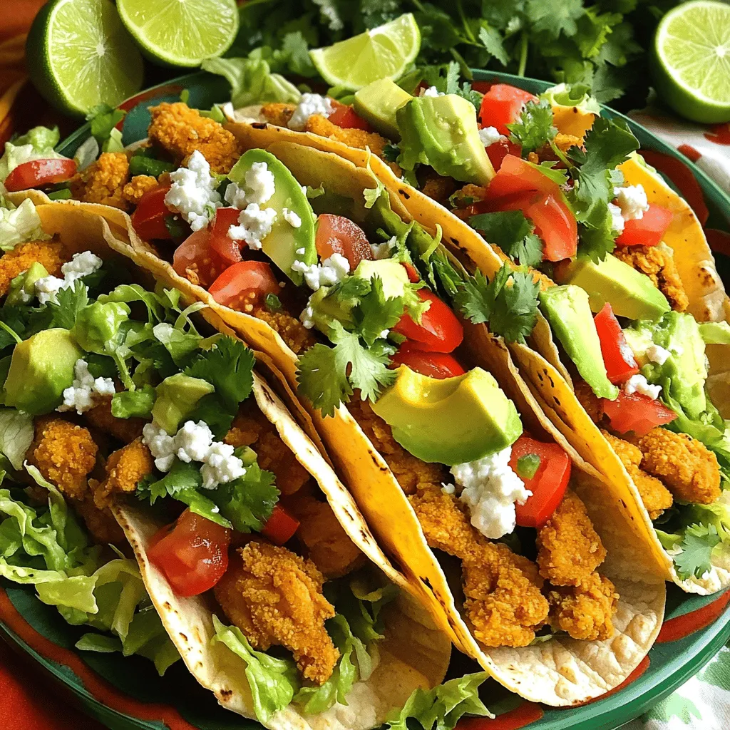 ![- 1 lb chicken breast, cut into bite-sized pieces - 1 cup buttermilk - 1 cup all-purpose flour - 1 cup cornmeal - 1 teaspoon paprika - 1 teaspoon garlic powder - 1 teaspoon onion powder - 1 teaspoon chili powder - Salt and pepper to taste - Vegetable oil for frying You need fresh chicken and buttermilk for the best flavor. The buttermilk helps tenderize the chicken, making it juicy. Next, mix flour and cornmeal for the coating. The cornmeal adds a nice crunch. You’ll also want spices like paprika and garlic powder to bring out great flavors. Salt and pepper are key, too. - 8 small corn tortillas - 1 cup shredded lettuce - 1 cup diced tomatoes - ½ cup crumbled queso fresco or feta cheese - 1 avocado, sliced - ¼ cup fresh cilantro, chopped - Lime wedges for serving Now, let’s talk about toppings. Fresh veggies like lettuce and tomatoes add crunch and color. Cheese, like queso fresco or feta, gives a creamy touch. Avocado slices bring richness, while lime adds zing. These fresh toppings balance the crispy chicken and make your tacos pop. You can find the full recipe [here]. Marinating makes the chicken juicy and tasty. It helps the chicken soak up flavors. I recommend marinating for at least 30 minutes. For the best taste, let it sit overnight in the fridge. This ensures a deep, rich flavor. In a bowl, mix flour, cornmeal, paprika, garlic powder, onion powder, chili powder, salt, and pepper. This mix gives the chicken a nice crunch. When you coat the chicken, dredge each piece well. Make sure it’s fully covered. Shake off any extra flour to avoid clumps. Heat oil in a large skillet until it shimmers. This means it’s hot enough for frying. Aim for medium-high heat. Fry the chicken pieces in batches. This keeps them crispy. Each piece should cook for about 4 to 5 minutes per side. They should turn golden brown. After frying, place them on a plate lined with paper towels to soak up any extra oil. Toasting the tortillas brings out their flavor. In a separate pan, toast each corn tortilla for about 30 seconds on both sides. This makes them warm and soft. To keep them warm, stack the tortillas and cover them with a clean kitchen towel. Now for the fun part! Take a warm tortilla and add a few pieces of crispy chicken. Then, top it with shredded lettuce, diced tomatoes, and avocado slices. Sprinkle some queso fresco and fresh cilantro on top. For a great touch, squeeze fresh lime juice over the tacos before serving. This adds a zesty kick. For more details, check out the Full Recipe. To get that perfect crunch, fresh oil is key. Old oil can make your chicken soggy. Fresh oil keeps each bite crisp. When you heat the oil, it should shimmer. This means it's hot enough for frying. Adding cornmeal to your coating helps too. It gives a nice texture and extra crunch. Mix it well with your flour and spices. This mix makes every piece of chicken extra crispy. Pair your tacos with sides like rice or beans. These add flavor and make a complete meal. Fresh guacamole or a simple salad can also work well. They balance the richness of the tacos. For drinks, try a cold beer or a fruity soda. A zesty margarita can be great too. These drinks make your meal even more enjoyable. Don't overcrowd the pan when frying. If you add too many pieces, the oil cools. This leads to less crispy chicken. Fry in small batches for the best results. Check the oil temperature often. If it's too low, your chicken absorbs too much oil. If it's too high, the outside burns before the inside cooks. A good range is between 350°F to 375°F for frying. {{image_2}} You can make your tacos spicy by adding jalapeños. Slice fresh jalapeños and add them on top of the chicken. You can also mix chopped jalapeños into the marinade for extra heat. This adds a nice kick. For seasoning, try adding cayenne pepper or chipotle powder. These spices will give your chicken a smoky flavor. Mix these spices into the flour coating before dredging the chicken. This simple change will elevate your tacos. If you want a healthier option, consider baking instead of frying. To bake, preheat your oven to 400°F. Place the coated chicken on a baking sheet and spray with cooking oil. Bake for about 20–25 minutes, flipping halfway through. This method cuts down on oil and calories. You can also use whole wheat tortillas. They add fiber and nutrients compared to regular corn tortillas. Whole wheat wraps hold up well with fillings and still taste great. You can create tasty vegetarian tacos by substituting chicken with cauliflower. Cut cauliflower into bite-sized pieces. Coat them in buttermilk and your flour mixture just like you would with chicken. Bake or fry until crispy. For a vegan option, use tofu. Press the tofu to remove excess moisture. Cut it into cubes and marinate in buttermilk, or use a plant-based alternative. Coat the tofu in your flour mix and fry or bake until golden. These options are delicious and fun to try. For the full recipe, check out the Crispy Chicken Tacos. You can store leftover tacos in the fridge. First, separate the chicken from the tortillas and toppings. This keeps everything fresh. Place the chicken in an airtight container. Wrap the tortillas in foil or plastic wrap. Store the toppings in separate containers. Your chicken stays good for about 3 days. When it’s time to reheat, avoid the microwave. This can make the chicken soggy. Instead, use the oven or a skillet. Preheat the oven to 350°F (175°C). Place the chicken on a baking sheet and heat for about 10 minutes. For tortillas, wrap them in foil and warm for 5 minutes. This keeps them soft and tasty. If you want to save tacos for later, freezing is a great option. Start by cooling the cooked chicken completely. Place it in a freezer-safe bag. Remove as much air as possible. You can freeze the chicken for up to 3 months. For the tortillas, you can freeze them, too. Place wax paper between each tortilla to prevent sticking. When you’re ready to eat, move the chicken