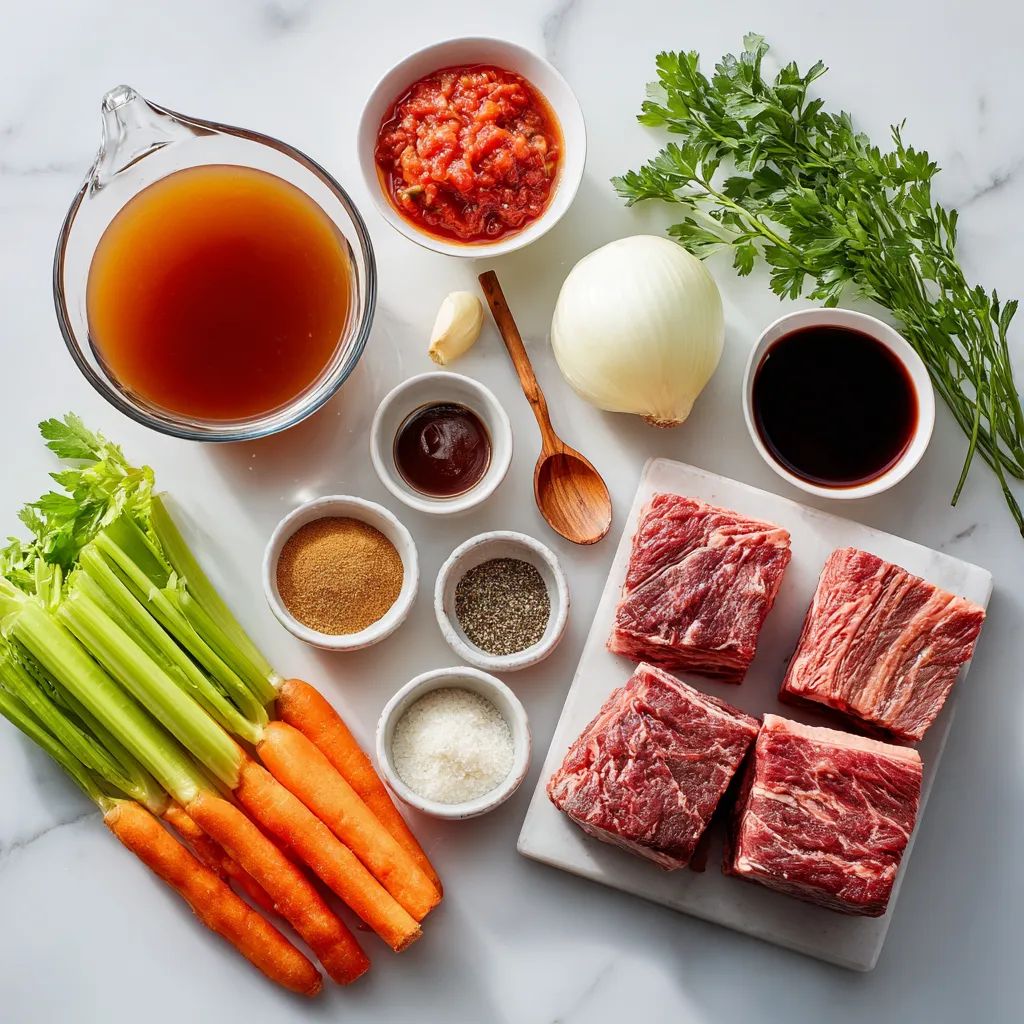 Each ingredient plays a key role. The beef short ribs are the star, rich and savory. The chopped onion and minced garlic add depth and aroma. Carrots and celery bring sweetness and texture. The beef broth and crushed tomatoes create a flavorful base. Brown sugar balances the savory notes, while soy sauce and Worcestershire add umami. Smoked paprika gives a hint of smokiness, and thyme adds a lovely herbal touch. Finally, fresh parsley brightens up your dish as a garnish.