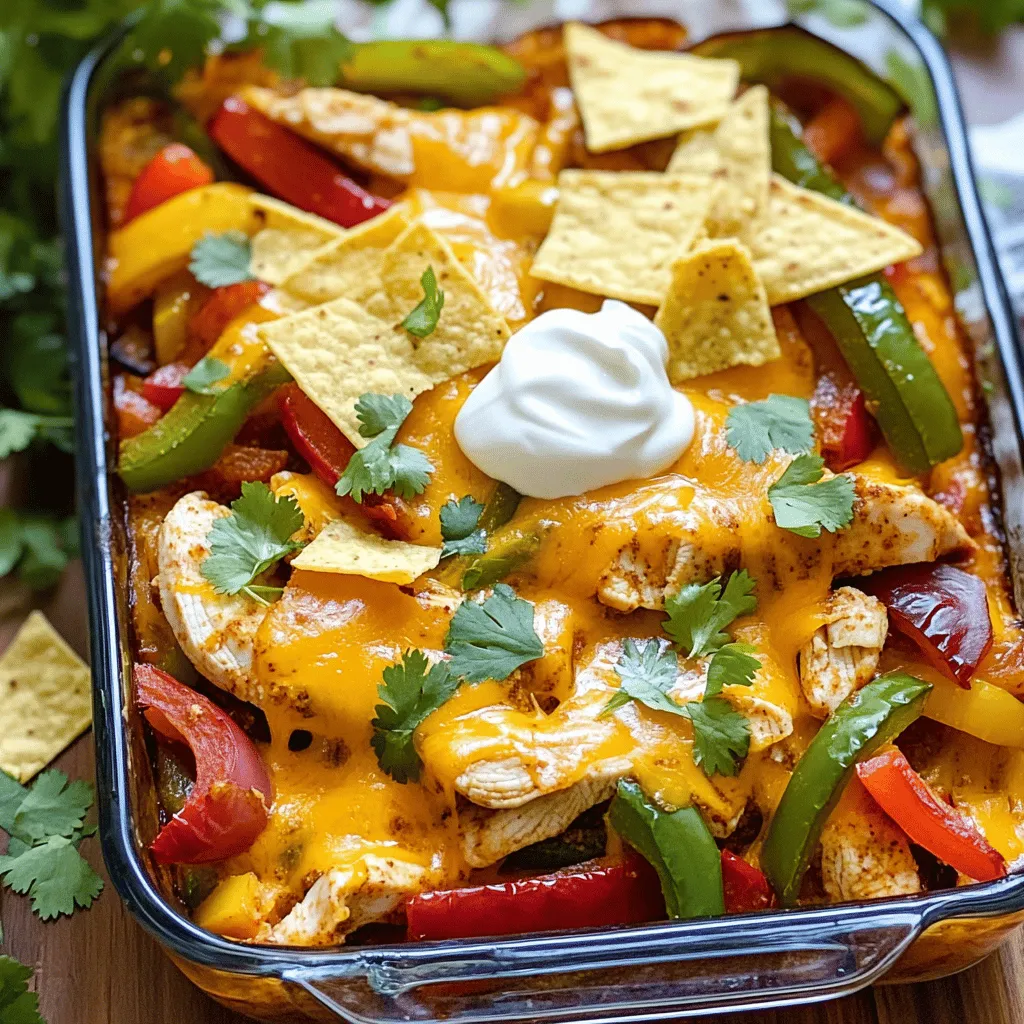 ![- 2 boneless, skinless chicken breasts, sliced thin - 1 red bell pepper, sliced - 1 green bell pepper, sliced - 1 yellow onion, sliced - 2 tablespoons olive oil - 2 tablespoons fajita seasoning - 1 cup shredded cheddar cheese - 1 cup salsa - 8 small flour tortillas - Fresh cilantro, for garnish - Sour cream or Greek yogurt, for serving (optional) The first step is to gather your main ingredients. You need chicken and vegetables. Choose fresh, vibrant bell peppers. They add color and crunch. The fajita seasoning brings bold flavor to the dish. You can buy it pre-made or mix your own spices. Next, we add cheese and tortillas. Shredded cheddar melts beautifully on top. It gives a creamy texture to each bite. The tortillas will create a crispy topping. This makes the dish even more appealing. You can find the full recipe to see all the steps. Enjoy cooking this dish with these simple, tasty ingredients! Preheating the Oven Start by preheating your oven to 375°F (190°C). This step is key for even cooking. Mixing Ingredients In a large bowl, combine the sliced chicken, bell peppers, onion, olive oil, and fajita seasoning. Toss well until all the pieces are coated. This mix is where the flavors start to build. Assembling the Dish Grab a 9x13 inch baking dish. Spread the chicken and vegetable mix evenly across the bottom. Pour the salsa over the top, spreading it out evenly. Now, sprinkle the shredded cheddar cheese across the mixture. This will melt and create a delicious layer. Tear the flour tortillas into bite-sized pieces and scatter them on top. This adds a nice crispy texture when it bakes. Covering and Initial Bake Cover the baking dish with aluminum foil. Bake for 25 minutes. This keeps the dish moist and helps the chicken cook through. Uncovering and Final Bake After 25 minutes, carefully remove the foil. Bake for an additional 10-15 minutes. Look for the cheese to be bubbling and golden brown. This is when it gets really tasty! Cooling and Serving Once baked, remove the dish from the oven. Let it cool for a few minutes to avoid burns. Garnish with fresh cilantro. Serve with sour cream or Greek yogurt on the side for a creamy touch. Enjoy your Easy Chicken Fajita Bake! For the complete recipe, check the [Full Recipe]. - Cutting Chicken and Vegetables: Slice the chicken and vegetables evenly. Thin slices cook faster. Aim for about a quarter-inch thickness. This ensures the chicken stays juicy while the veggies soften nicely. - Achieving Maximum Flavor: Use fresh fajita seasoning. You can also make your own with chili powder, cumin, and garlic powder. Toss the chicken and veggies well in olive oil and seasoning. Let them marinate for 15-30 minutes if you have time. This boosts the taste. - Ensuring Proper Baking: Preheat your oven to 375°F first. Cover the dish with foil for the first bake. This keeps moisture in. Remove the foil later for a crispy cheese topping. Bake until the cheese is golden and bubbly. This usually takes 10-15 extra minutes. - Ideal Accompaniments: Pair your fajita bake with rice or beans. These sides balance the flavors well. You can also enjoy it with tortilla chips for some added crunch. - Adding Garnishes: Fresh cilantro adds a bright flavor. Sour cream or Greek yogurt gives a creamy touch. You can also add avocado slices for creaminess. - Make-Ahead Tips: Prepare the chicken and veggies the night before. Store them in the fridge. You can assemble and bake the dish in the morning. This saves time and makes for a quick meal. For the full recipe, check out Easy Chicken Fajita Bake. {{image_2}} Protein Alternatives You can change the chicken to make this dish your own. Try using shrimp or beef strips instead. For a lighter option, use turkey. Each protein adds a unique flavor and texture. Vegetable Customizations Feel free to swap any veggie you like. Try zucchini, mushrooms, or corn for a twist. You could even add spinach or kale for a healthy boost. Mixing colors makes the dish pop and taste better. Different Cheeses Cheese adds creaminess and flavor. If you want a stronger taste, use pepper jack or Monterey Jack. For a milder flavor, stick with mozzarella. Mixing cheeses can also give a tasty result. Adjusting Spice Levels You can make this dish as spicy or mild as you want. If you prefer less heat, lessen the fajita seasoning. You can also leave out spicy peppers or use sweet bell peppers instead. Adding Heat with Peppers If you love spice, add jalapeños or serrano peppers. You can slice them thin and mix them in with the other veggies. This will give your dish a nice kick without overpowering. Creating a Vegetarian Version To make a vegetarian version, leave out the chicken. Replace it with extra beans or tofu for protein. You can still use all the same veggies and spices. This keeps the flavors strong and satisfying. For the full recipe, check out [Full Recipe]. Refrigeration Tips After enjoying your Easy Chicken Fajita Bake, store leftovers in an airtight container. Make sure to cool the dish to room temperature first. Place the container in the fridge. Properly stored, it will last for up to four days. If you want to keep it fresh longer, consider freezing it. Freezing Guidelines For freezing, use a freezer-safe container. You can also wrap individual portions in plastic wrap and then place them in a freezer bag. This way, you can take out just what you need later. The dish can be frozen for up to three months. Just remember to label your container with the date. Oven Method To reheat in the oven, preheat it to 350°F (175°C). Place the fajita bake in a baking dish. Cover it with foil to keep it moist. Heat for about 20-25 minutes or until it’s hot throughout. Remove the foil for the last few minutes if you want a crispy top. Microwave Method For a quick reheating option, use the microwave. Place a single portion on a microwave-safe plate. Cover it with a microwave-safe lid or wrap. Heat on high for 1-2 minutes. Check if it’s hot enough; if not, 