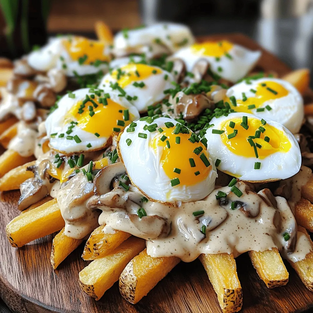 Once the fries are crispy and golden, take them out of the oven. Place the fries on a large platter. Pour the mushroom sauce generously over the fries. Finally, top the loaded fries with the poached eggs. For a burst of flavor, garnish with fresh chives or parsley. Enjoy your Egg Mushroom Sauce Fries!