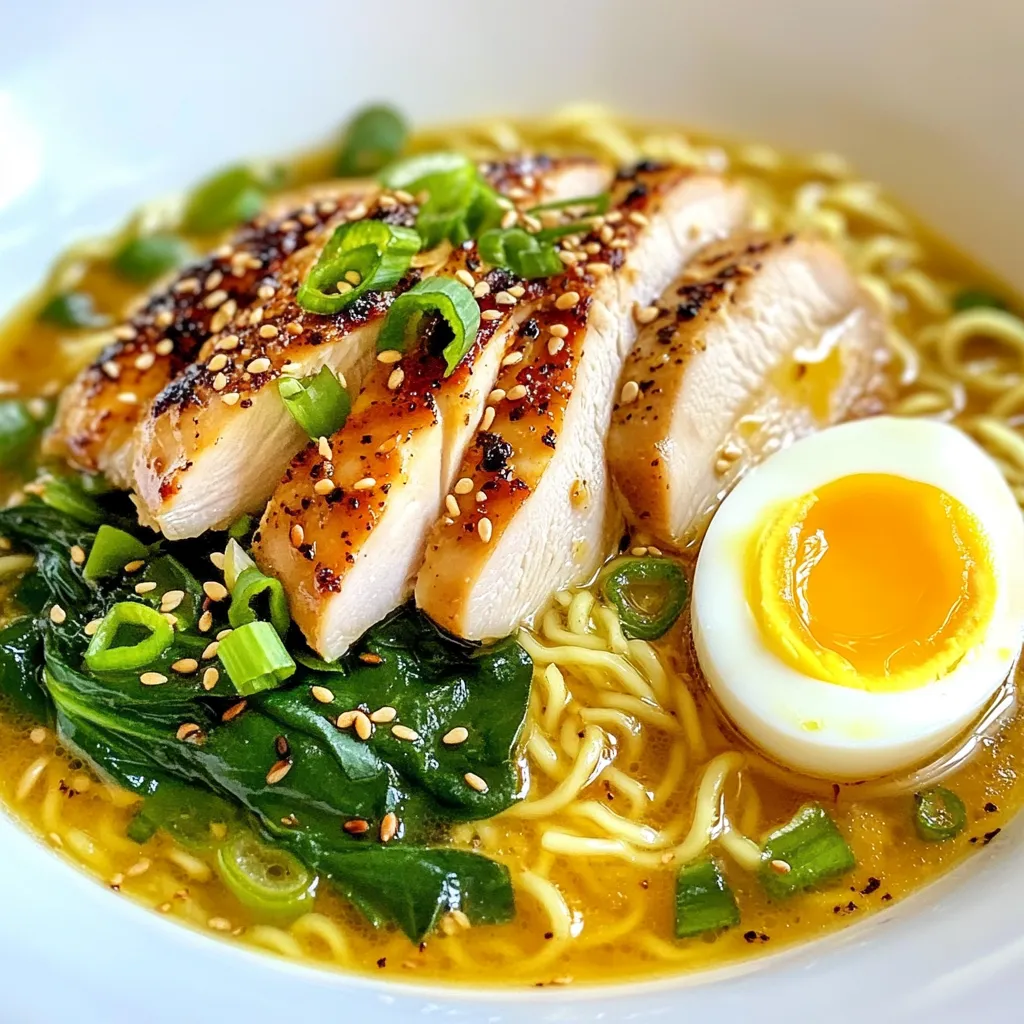 Presentation matters! Serve the ramen in deep bowls. Arrange the chicken and spinach neatly. Place the soft-boiled egg on top and sprinkle with green onions. A beautiful dish makes every bite more enjoyable.