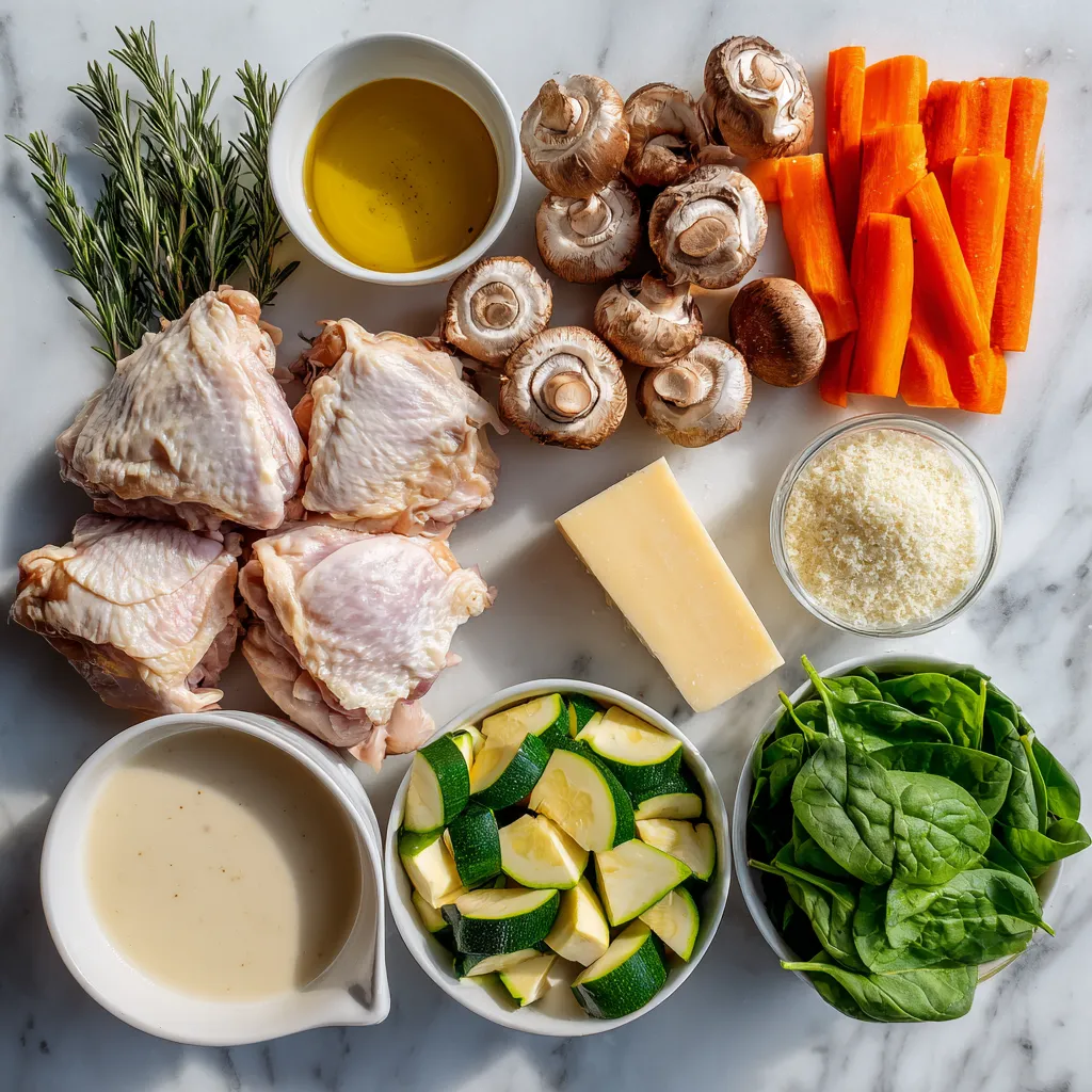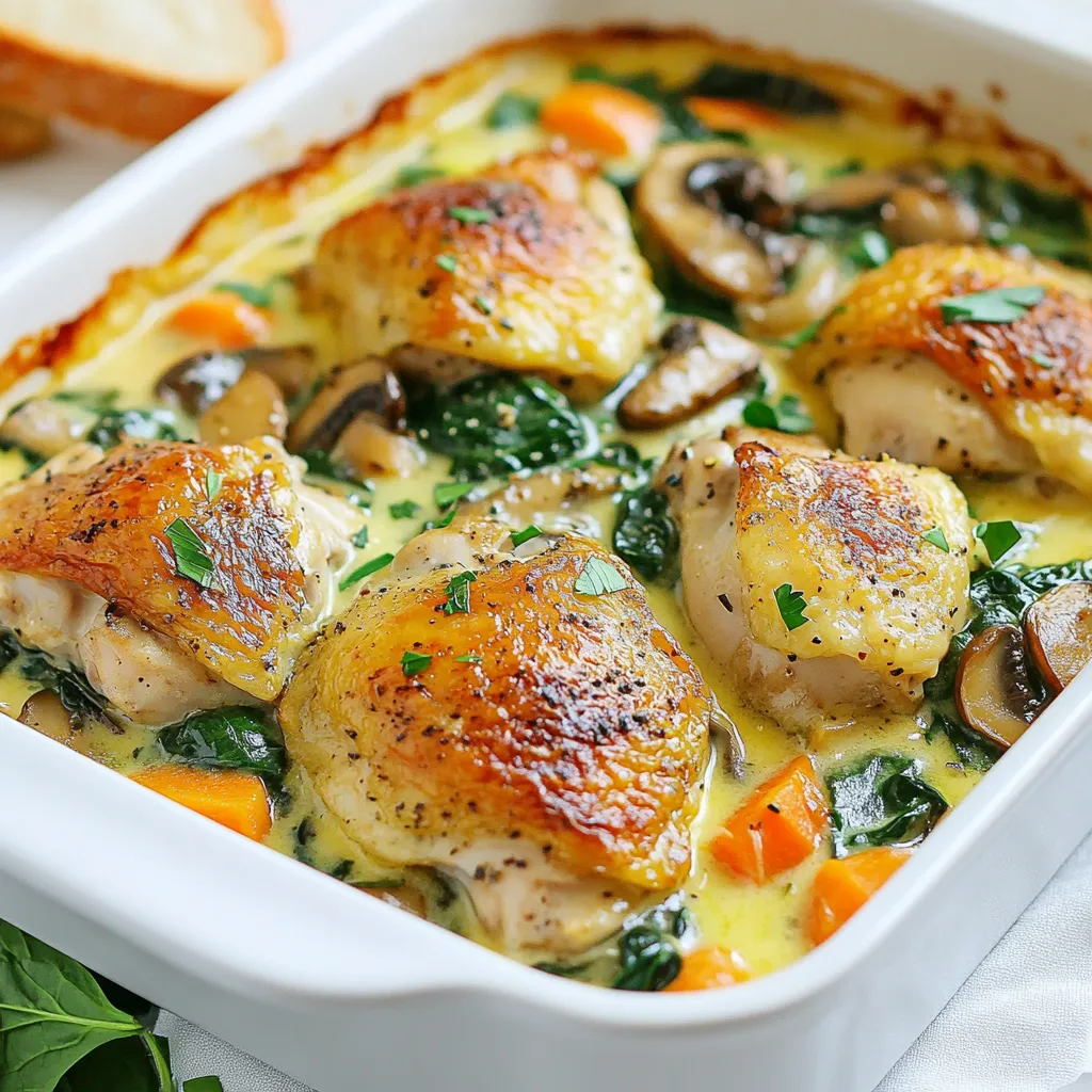 - In a large casserole dish, layer the sautéed vegetables and chicken thighs evenly. Top with fresh spinach and sprinkle the grated Gruyère cheese over the entire mixture.