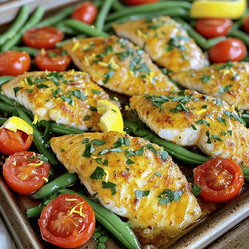 Take a large sheet pan and place the tilapia fillets in the center. They should sit flat. Drizzle half of the garlic butter mixture over the fillets. Make sure they get a good coat. In another area of the pan, add the halved cherry tomatoes and green beans. Drizzle the rest of the garlic butter over these veggies. Toss them gently to coat. This step helps the flavors mix well.