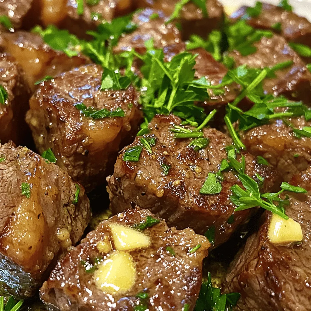 ![- 1 lb flank steak, cut into bite-sized cubes - 4 tablespoons unsalted butter - 4 cloves garlic, minced - 1 teaspoon fresh rosemary, finely chopped - 1 teaspoon fresh thyme, finely chopped - Salt and pepper to taste - 1 tablespoon olive oil - 1 tablespoon fresh parsley, chopped (for garnish) - Additional spices or herbs - Alternative cuts of steak - Side dishes (e.g., roasted vegetables, mashed potatoes) - Sauces (e.g., chimichurri, peppercorn sauce) The key to great garlic butter steak bites starts with quality ingredients. I always choose flank steak for its rich flavor and tenderness. It cooks fast and absorbs the garlic butter well. Using unsalted butter lets you control the salt level. Fresh garlic, rosemary, and thyme add a burst of flavor. I love how these herbs brighten up the dish. Salt and pepper are crucial for seasoning. Make sure to taste your dish as you cook. Olive oil helps sear the steak perfectly. Finally, fresh parsley gives a pop of color when you serve. Feel free to swap herbs or add spices to suit your taste. You can also try different cuts of steak if you prefer. For sides, I recommend roasted veggies or creamy mashed potatoes. A tasty sauce like chimichurri or peppercorn sauce can make your meal shine. For the full recipe, check the details above. Enjoy making your garlic butter steak bites! To start, you need to season the steak well. Sprinkle salt and pepper on all sides. This step gives your steak bites great flavor. Take a moment to prepare your work area. Gather your tools like a large skillet, a cutting board, and a sharp knife. Make sure everything is clean and ready to use. Next, heat your skillet over medium-high heat. Add olive oil and let it shimmer. This means it's hot enough for cooking. Place the steak bites in a single layer. If your skillet is small, sear in batches. Cook for 2-3 minutes on one side. Then flip them and cook for another 2-3 minutes for medium-rare. Adjust the time for your preferred doneness. Once cooked, remove the steak from the pan and set it aside. In the same skillet, lower the heat to medium. Add the unsalted butter and let it melt. After the butter melts, add the minced garlic, rosemary, and thyme. Stir for 1-2 minutes. Watch the garlic closely; you want it fragrant, not burnt. The goal is to create a rich, flavorful sauce. Once ready, return the seared steak bites to the pan. Toss them in the garlic butter sauce for about a minute. This step makes sure every bite is coated in flavor. Enjoy your Garlic Butter Steak Bites! For complete details, check out the Full Recipe. For the best steak bite, cook it right. I recommend these times for doneness: - Rare: 2 minutes per side - Medium-rare: 3 minutes per side - Medium: 4 minutes per side - Well-done: 5-6 minutes per side To check doneness without a thermometer, press the steak. Rare feels soft, while well-done is firm. Practice this method to get a feel for it. You can customize the garlic butter with more herbs or spices. Try adding: - Fresh basil - Oregano - Red pepper flakes Always use high-quality ingredients. Fresh steak and real butter make a big difference. Your dish will taste much better with good stuff. Garnishing makes your dish pop! Here are some ideas: - Sprinkle fresh parsley on top - Add a slice of lemon on the side Serve these steak bites with roasted veggies or mashed potatoes. Place them on a nice plate to impress your guests. For the full recipe, check the detailed instructions above. {{image_2}} You can swap out steak for chicken, shrimp, or even mushrooms. Chicken offers a lighter option. Shrimp cooks fast and adds a sweet taste. For a plant-based option, mushrooms absorb flavors well. When using chicken, cut it into bite-sized pieces like the steak. If you choose shrimp, clean and devein them first. For mushrooms, use hearty types like portobello or shiitake. Each protein needs slight changes in cooking time. Chicken should reach 165°F, while shrimp cooks in just a few minutes. Mushrooms need a bit more sauté time to get tender. You can give garlic butter steak bites an Asian twist. Just add soy sauce and ginger to the butter. This gives the dish a savory, umami flavor. You can also sprinkle sesame seeds for extra crunch. For a Mediterranean flair, mix in feta cheese and olives. The salty feta pairs well with the rich butter. Chopped sun-dried tomatoes add a nice burst of flavor too. You can grill or cook these bites in a skillet. Grilling gives them a smoky taste, while skillet cooking allows for a rich, buttery sauce. If you want a healthier choice, try an air fryer. It cooks steak bites quickly and keeps them juicy. Just toss the seasoned bites in the air fryer for about 8-10 minutes. For the full recipe, click here: [Full Recipe]. Store your leftover garlic butter steak bites in the fridge. Place them in an airtight container. This keeps them fresh for about 3 days. Make sure they cool down before sealing. If you don't have an airtight container, use plastic wrap. It will help prevent drying out. To reheat, use a skillet over low heat. This method keeps the texture and flavor. Stir the steak bites gently as they warm. You can also use a microwave, but watch the time. Heat in short bursts to avoid overcooking. Overcooking can make the steak tough. You can freeze garlic butter steak bites for longer storage. Place them in a freezer-safe bag. Remove as much air as possible to prevent freezer burn. They can last up to 3 months in the freezer. When ready to eat, thaw in the fridge overnight. Reheat them in a skillet for the best results. The best way to cook steak bites is on high heat. Start by heating your skillet until it is very hot. This helps to sear the meat well. You want that nice brown crust. Cook the steak bites for 2-3 minutes on each side. This timing gives you a great medium-rare steak. If you like it more done, add an extra minute or so. Remember to work in batches if needed. Overcrowding the pan can cause steaming instead of searing. Yes,
