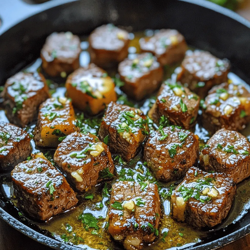 ![- 1 lb sirloin steak, cut into bite-sized cubes - 4 tablespoons unsalted butter - 4 cloves garlic, minced - 1 teaspoon fresh rosemary, chopped - 1 teaspoon fresh thyme, chopped - Salt and pepper to taste - 1 tablespoon olive oil - Fresh parsley, chopped (for garnish) The key to great garlic butter steak bites starts with fresh, quality ingredients. The sirloin steak is tender and flavorful, perfect for this dish. I love using unsalted butter for better control of the salt. Garlic adds a rich aroma and taste that enhances the steak. Fresh herbs like rosemary and thyme bring a lovely depth of flavor. When you season your steak, don’t hold back on the salt and pepper. They help to bring out the natural taste of the meat. The olive oil is also essential for cooking. It helps to sear the steak, adding a nice crust. Finally, parsley makes a beautiful garnish. It adds color and a hint of freshness. For the full recipe, I recommend checking the detailed instructions. They guide you through the steps to achieve the perfect garlic butter steak bites every time. Enjoy the process, and let the flavors shine! Start with the steak cubes. First, pat them dry using paper towels. This helps the steak brown nicely. Next, season the cubes with salt and pepper. Make sure to coat all sides evenly for the best flavor. Now it's time to cook. Heat 1 tablespoon of olive oil in a large skillet. Wait until it shimmers over medium-high heat. Then, add the steak cubes in a single layer. You may need to cook in batches. Sear them for 2-3 minutes on one side. Flip and cook for another 2-3 minutes for medium-rare. Adjust the time if you want it more well-done. Once cooked, remove them from the skillet and set aside. In the same skillet, lower the heat to medium. Add 4 tablespoons of unsalted butter and 4 cloves of minced garlic. Stir for about 1 minute. You want the garlic to smell good but not burn. Then add the cooked steak bites back to the skillet. Toss them well in the garlic butter sauce. Cook for one more minute to let the flavors mix. Finally, remove from heat and garnish with chopped parsley. For the full recipe, check the section above! To get steak bites just right, timing matters. For medium-rare, cook them for 2-3 minutes on each side. For medium, aim for 3-4 minutes. You can use a meat thermometer for best results. The ideal temperature is 130°F for medium-rare and 140°F for medium. This tool ensures you hit the sweet spot every time. To boost the flavor, think beyond salt and pepper. Try adding a dash of smoked paprika or cumin for warmth. If you love herbs, consider using fresh oregano or thyme. Each herb brings out the steak's rich taste. Pairing rosemary with garlic is a classic that never fails. When serving, a warm cast-iron skillet adds charm. You can also use a wooden cutting board for a rustic look. Garnish your dish with fresh parsley. It not only looks great but adds a fresh taste. For easy snacking, place toothpicks next to the bites. This makes them fun and easy to enjoy. For the full recipe, check out the details provided above. {{image_2}} You can switch up the protein in garlic butter steak bites. Try using chicken or shrimp. Both options cook quickly and soak up the garlic flavor well. For chicken, cut it into bite-sized pieces just like the steak. Cook it until golden and juicy. For shrimp, use large shrimp and sauté them for 2-3 minutes per side. If you want a vegetarian option, mushrooms are a great choice. Use hearty varieties like portobello or cremini. Slice them thick and cook until they are tender. They will absorb the garlic butter beautifully. To spice things up, add chili flakes to your garlic butter sauce. This gives the dish a nice kick. Start with a pinch and adjust to your taste. You can also explore different herbs. Instead of rosemary or thyme, try using oregano or basil. Fresh herbs add a nice twist to the flavor. Each herb brings its unique taste, making the dish fun and fresh. Garlic butter steak bites pair well with many side dishes. Consider serving them with a crisp salad or roasted vegetables. The freshness of the salad balances the richness of the steak. For a fun twist, serve them with a dipping sauce. A creamy garlic aioli or a zesty chimichurri sauce works great. These sauces add more flavor and make the meal even more special. For the full recipe, refer to the description above. After enjoying your garlic butter steak bites, let them cool down. This step stops steam from building up in the container. Use an airtight container for the best storage. You can also wrap them in plastic wrap or foil. Store them in the fridge for up to three days. To reheat steak bites, I suggest using a skillet. Heat it over low to medium heat. Add a splash of olive oil or a bit of butter to keep them moist. Stir often to avoid burning. You can also use the microwave, but cover the dish with a paper towel. This method helps keep moisture in. Yes, you can freeze garlic butter steak bites! Place them in a single layer on a baking sheet. Freeze them for about an hour, then transfer to a freezer bag. This way, they won’t stick together. When ready to eat, thaw in the fridge overnight. Then reheat as mentioned above. To check if your steak bites are done, use cooking times as a guide. - Rare: 2 minutes per side, 120°F - Medium-rare: 2-3 minutes per side, 130°F - Medium: 3-4 minutes per side, 140°F - Medium-well: 4-5 minutes per side, 150°F - Well-done: 5-6 minutes per side, 160°F These times depend on the heat of your skillet and steak size. Use a meat thermometer for best results. Yes, you can make a tasty sauce without butter. Here are some ideas: - Use olive oil or avocado oil for a lighter option. - Add cream for a rich, creamy sauce. - Try using ghee for a dairy-free alternative. You can mix in herbs, lemon juice, or spices for flavor. You can serve garlic butter steak bites with many sides. Here are some ideas: - Appetizers: Garlic bread or bruschetta. - Sides: Roaste