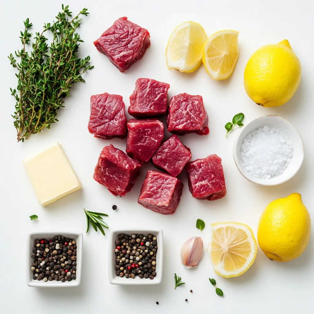 In the same skillet, lower the heat to medium. Add the remaining 2 tablespoons of butter. Then, add 4 minced garlic cloves, 1 teaspoon of chopped rosemary, and 1 teaspoon of thyme leaves. Sauté for 1-2 minutes. Watch the garlic closely so it does not burn. When the kitchen smells great, return the steak bites to the skillet. Toss them in the garlic butter sauce to coat. Cook for an additional 1-2 minutes to heat everything through. Serve right away, garnished with chopped parsley and lemon wedges on the side. Enjoy your meal!