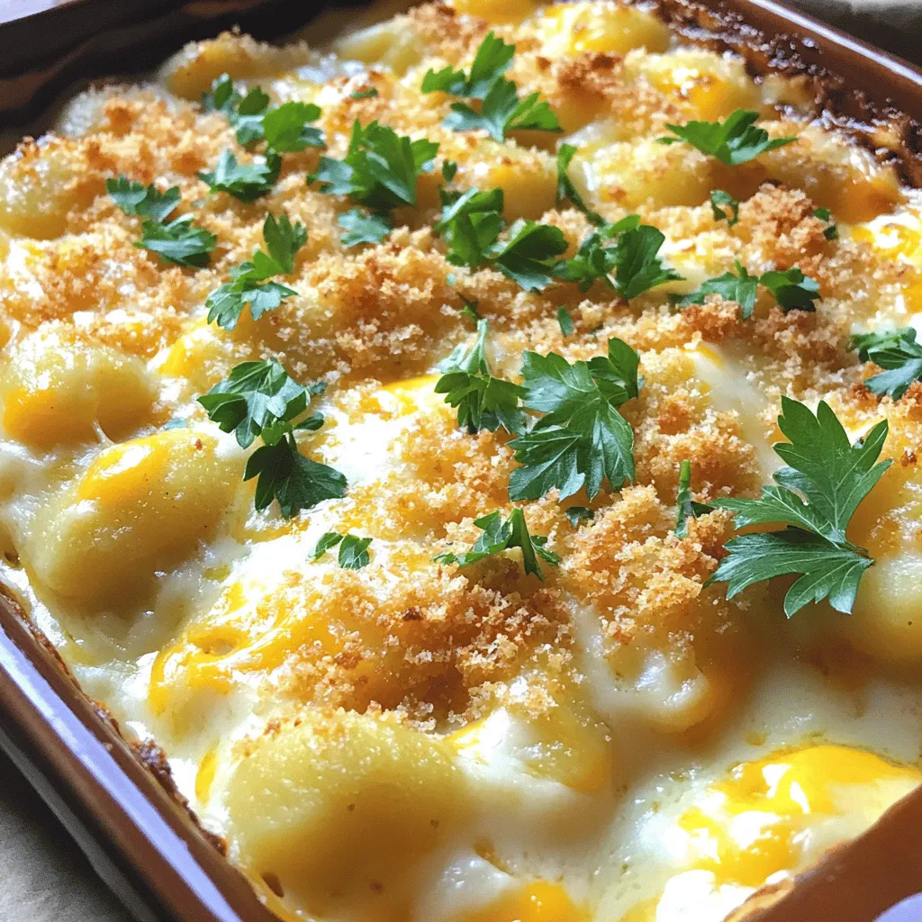 ![- Gnocchi (store-bought or homemade) - Dairy ingredients: milk, cheddar cheese, mozzarella cheese - Seasoning essentials: garlic powder, onion powder, ground mustard, salt, pepper - Topping ingredients: breadcrumbs, fresh parsley To make Gnocchi Mac and Cheese, you need a few key ingredients. First, gnocchi is the star of this dish. You can buy it or make your own. I love the texture of homemade gnocchi, but store-bought works just fine. Next, gather your dairy ingredients. You will need whole milk, sharp cheddar cheese, and mozzarella cheese. These cheeses melt well and give the dish a creamy texture. I recommend using sharp cheddar for its bold flavor. Seasoning is essential. Use garlic powder, onion powder, and ground mustard. These spices add depth to the cheese sauce. Don't forget salt and pepper to enhance the taste. Finally, for the topping, grab some breadcrumbs and fresh parsley. The breadcrumbs add a nice crunch, while parsley brightens the dish. You can find the Full Recipe for complete details on how to combine all these ingredients into one delicious meal. To make gnocchi, start by boiling a large pot of water. Add about 1 tablespoon of salt to the water. Salting the water is key, as it enhances the flavor of the gnocchi. Once the water boils, add the gnocchi. Cook them until they float, which takes about 2-3 minutes. This means they are done. Drain the gnocchi and set them aside. Next, it’s time to make the cheese sauce. Begin by melting 2 tablespoons of butter in a large saucepan over medium heat. Once melted, stir in 2 tablespoons of all-purpose flour. This creates a roux. Cook it for about 1 minute until it bubbles slightly. Gradually add 2 cups of whole milk while whisking. This helps to eliminate lumps. Keep stirring until the sauce thickens, which takes about 5-7 minutes. Once thick, lower the heat and add in 2 cups of shredded cheddar cheese and 1 cup of shredded mozzarella cheese. Stir until the cheeses melt and the sauce becomes creamy. Don’t forget to season it with garlic powder, onion powder, ground mustard, salt, and pepper. For baking, preheat your oven to 350°F (175°C). If you like, transfer the gnocchi and cheese mixture into a greased 9x13 inch baking dish. In a small bowl, mix ½ cup of breadcrumbs with a drizzle of olive oil and some salt. Sprinkle this mixture evenly over the top of the gnocchi and cheese. Bake the dish for 20-25 minutes until the top is golden and crispy. For the complete recipe, check the [Full Recipe]. To make your Gnocchi Mac and Cheese creamy, choose good cheese. I love using sharp cheddar and mozzarella. They melt well and give a rich flavor. Mixing these two cheeses adds depth. You can also try Gruyère or fontina for a unique taste. These cheeses add a nutty flavor that pairs nicely with the gnocchi. Avoid clumping in your cheese sauce by whisking well. Start with a smooth roux when you mix the butter and flour. Gradually add the milk while whisking to keep it smooth. This helps prevent lumps. To get a golden breadcrumb topping, mix breadcrumbs with a little olive oil. This gives them a nice crunch. Spread them evenly on top before baking for the best result. For a lovely presentation, serve Gnocchi Mac and Cheese in individual bowls. Add a sprinkle of extra cheese or parsley on top. This makes the dish pop with color. Pair it with a light salad or crusty bread for a full meal. For drinks, a chilled white wine like Sauvignon Blanc works well. It balances the richness of the cheese. Enjoy your creamy comfort food delight! {{image_2}} You can easily swap cheese to fit your taste. For a lighter option, use reduced-fat cheese. If you want a sharper flavor, try aged cheddar. You can also mix cheeses, like Gouda or Fontina, for a rich taste. For a vegan version, choose non-dairy cheese made from nuts or soy. Use almond or oat milk in place of whole milk. This keeps the dish creamy without dairy. Want to make it heartier? Try adding proteins like crispy bacon or grilled chicken. They add great flavor and texture. You can also mix in cooked sausage for something different. Adding vegetables boosts nutrition, too. Spinach, broccoli, or peas work well. Just cook them lightly before adding to the dish. This helps keep the colors bright and flavors fresh. You can make Gnocchi Mac and Cheese on the stovetop or bake it. Stovetop is quick and easy. Just cook the gnocchi, make the sauce, and combine. Baking gives a crunchy top. After mixing everything, transfer it to a baking dish. Top with breadcrumbs and bake until golden. Another fun method is the one-pot Gnocchi Mac and Cheese. Just cook the gnocchi in the sauce. This saves time and cleanup. Follow the Full Recipe for a detailed guide on how to do this. To keep your Gnocchi Mac and Cheese fresh, store it in an airtight container. This helps to keep it safe from air and moisture. Make sure it cools to room temperature first. You can safely keep it in the fridge for up to three days. If you want to save it for longer, freezing is a great option. Divide it into smaller portions for easy thawing later. Wrap each portion tightly in plastic wrap, then place them in a freezer-safe bag. This way, it can last for about three months in the freezer without losing its flavor. When it's time to enjoy your leftovers, you have two good options: microwaving or using the oven. Microwaving is quick and easy. Place a portion in a microwave-safe dish and cover it. Heat it in short bursts, stirring in between, until it’s hot. If you prefer the oven, preheat it to 350°F (175°C). Place the Gnocchi Mac and Cheese in a baking dish, cover it with foil, and heat for about 15-20 minutes. This method helps keep the top crispy. After refrigeration, your dish may lose some creaminess. To fix this, add a splash of milk or cream when reheating. Stir well to restore that rich, creamy texture. Enjoy every bite of your tasty dish! Gnocchi Mac and Cheese lasts about 3 to 5 days in the fridge. Store it in an airtight