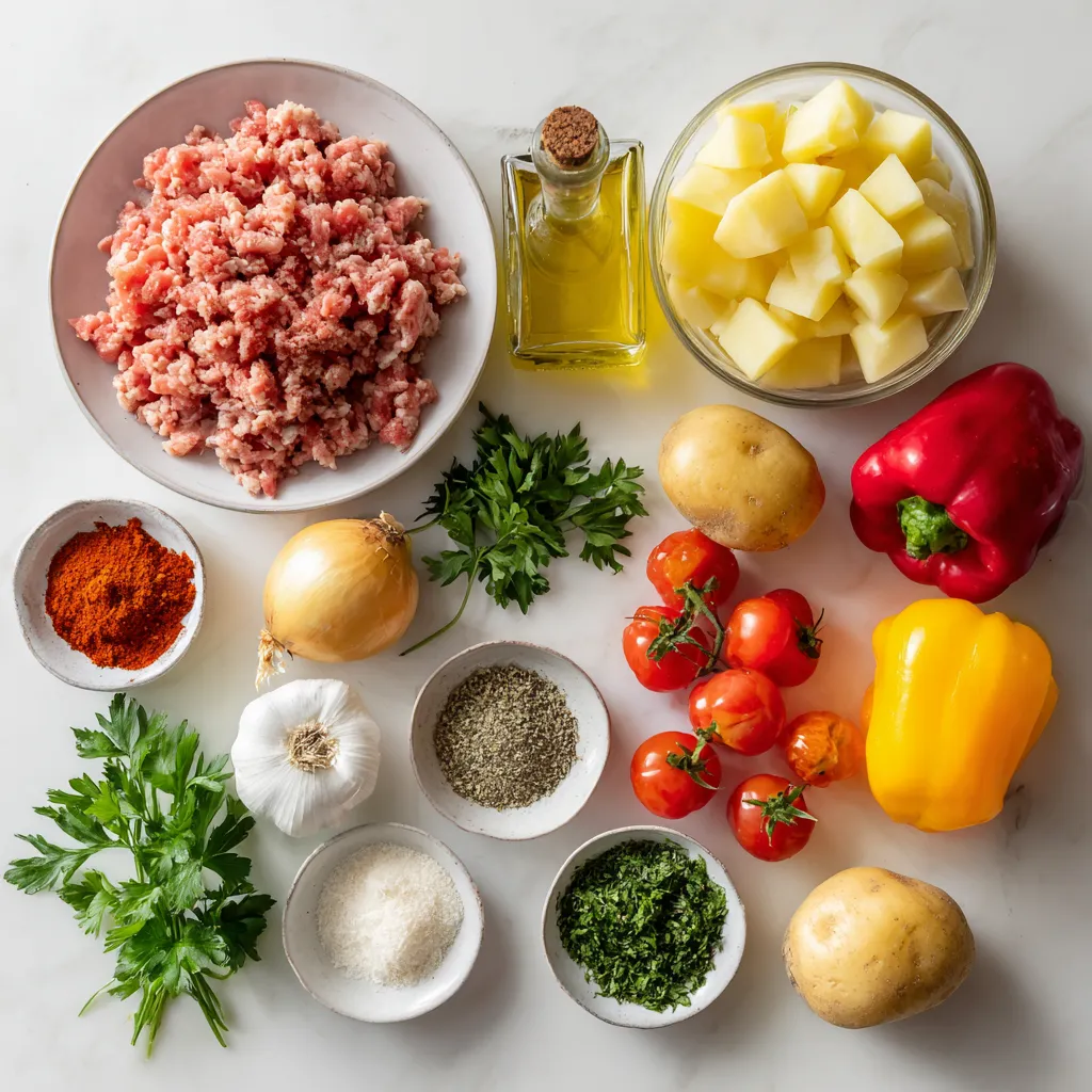 The main ingredients create a hearty base. Ground turkey is lean, making it a great protein choice. Potatoes add a filling texture, while onions and bell peppers enhance the flavor. Garlic gives a nice kick, and cherry tomatoes add sweetness.