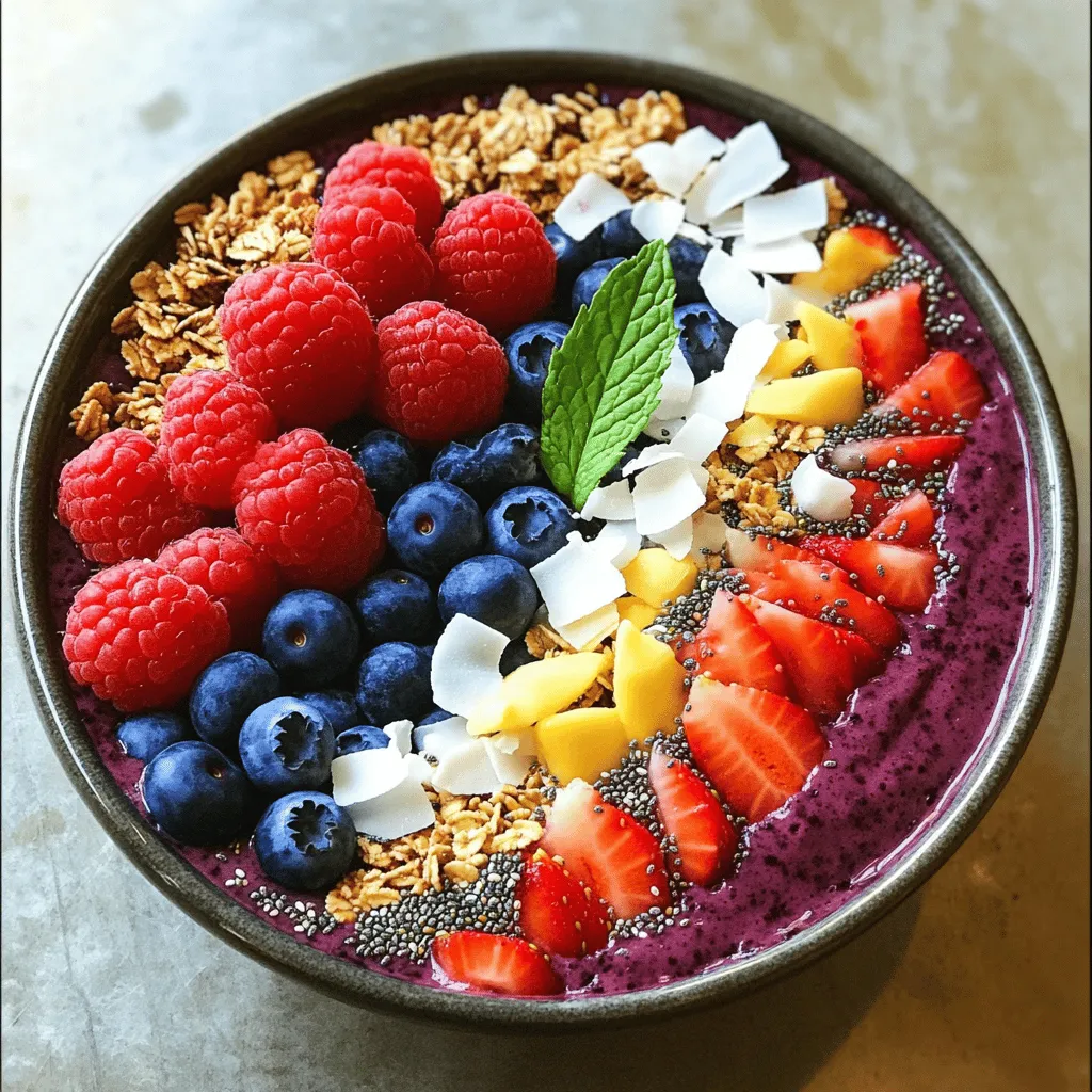![To make a tasty açaí bowl, you need simple ingredients. Here is what you will need: - 2 packets frozen açaí puree (about 100g each) - 1 ripe banana - ½ cup almond milk (or any milk of choice) These three items create the base of your bowl. The açaí puree gives a deep, fruity flavor. The banana adds creaminess and natural sweetness. Almond milk helps blend everything smoothly. You can add sweeteners for extra flavor. Here are some options: - 1 tablespoon honey or agave syrup (optional) If you like your bowl sweeter, add honey or agave syrup. These sweeteners blend well without overpowering the açaí flavor. Toppings make your açaí bowl fun and colorful. Here are some great choices: - ½ cup granola - ½ cup mixed berries (strawberries, blueberries, raspberries) - 1 tablespoon chia seeds - 1 tablespoon coconut flakes - Mint leaves for garnish Granola adds a nice crunch. Mixed berries bring bright colors and more flavor. Chia seeds and coconut flakes add texture and nutrients. Finish with a mint leaf for a fresh touch. You can find the full recipe to create your perfect açaí bowl. Enjoy customizing and exploring flavors! To start, gather your ingredients. You need two packets of frozen açaí puree, a ripe banana, and half a cup of almond milk. If you like, add a tablespoon of honey or agave syrup for sweetness. 1. Place the frozen açaí puree, banana, almond milk, and honey in a blender. 2. Blend until smooth and creamy. If the mix is too thick, add more almond milk. 3. Once blended, pour the mixture into a bowl. This is your rich açaí base. Now comes the fun part—layering your toppings! 1. Start with half a cup of granola. Place it on one side of the bowl. 2. Next, take half a cup of mixed berries. Arrange strawberries, blueberries, and raspberries beside the granola. This adds color and freshness. 3. Sprinkle one tablespoon of chia seeds and coconut flakes over the top. This creates a nice contrast with the vibrant fruits. 4. Finally, add a sprig of mint leaves for a pop of green. It makes your bowl look beautiful. Your açaí bowl is ready to serve! 1. Grab a spoon and dig in right away. 2. Enjoy the mix of flavors and textures. The crunch of granola pairs well with soft fruit. 3. Feel free to share your bowl with friends. They will love it! For more details, check the Full Recipe. This simple and delicious açaí bowl will surely brighten your day! To get that smooth and creamy texture, use frozen açaí puree. Add a ripe banana and some almond milk to your blender. Blend until it is smooth. If it’s too thick, add a bit more milk. If it’s too runny, add more frozen açaí. You want it thick enough to hold your toppings well. Start with granola as your base. This adds crunch and flavor. Next, place your mixed berries on the side. Try to arrange them by color for a pretty look. Then, sprinkle chia seeds and coconut flakes on top. This layering makes it fun to eat and looks great in the bowl. You can prepare your açaí base the night before. Just blend the açaí, banana, and milk, then store in the fridge. In the morning, layer your toppings before serving. This saves time and keeps your breakfast fresh. Remember, you can switch up the toppings each day for variety. Check out the Full Recipe to explore more ideas! {{image_2}} You can add a tropical twist to your açaí bowl. Start with your base of açaí, banana, and almond milk. Then, mix in fresh mango and pineapple. They add a sweet, juicy flavor that brightens the bowl. Just chop the fruits and blend them in. You can also top with extra mango and pineapple for more texture. This bowl feels like a vacation in every bite! If you have nut allergies, don’t worry! You can still enjoy açaí bowls. Substitute almond milk with oat milk or coconut milk. Use nut-free granola or leave it out. You can sprinkle sunflower seeds or pumpkin seeds on top instead. These seeds give a nice crunch and add nutrition without nuts. Always check labels to ensure no hidden nuts in your ingredients. Making a vegan açaí bowl is easy and delicious! Stick to plant-based ingredients. Use agave syrup instead of honey for sweetness. Choose granola that is certified vegan. You can also add plant-based yogurt on top for creaminess. Don't forget fresh fruits like bananas and berries. They enhance the flavor and make the bowl colorful. You’ll love how creamy and satisfying a vegan açaí bowl can be! If you have leftover açaí bowl, store it in the fridge. Use an airtight container to keep it fresh. The bowl stays good for about one day. If you wait too long, the toppings may get soggy. To enjoy it again, just stir it up before eating. You can freeze açaí puree for later use. This is a great way to save time. Pour the puree into ice cube trays. Once frozen, pop out the cubes and place them in a ziplock bag. This method keeps the puree fresh for up to three months. When you need it, just blend a few cubes with your favorite fruits and milk. For best results, choose glass or BPA-free plastic containers. These keep your açaí bowl fresh longer. Glass containers do not absorb smells. Plastic ones are lightweight and easy to store. Ensure your container is tight-sealing to block air. This helps maintain the delicious taste and texture of your açaí bowl. Açaí is a small, dark purple berry from Brazil. It grows on açaí palm trees in the Amazon rainforest. People love açaí for its taste and health benefits. It is rich in antioxidants, fiber, and heart-healthy fats. This berry helps with energy and boosts your immune system. You will find açaí in smoothie bowls, drinks, and desserts. The vibrant color and unique flavor make it fun to eat. Açaí bowls are popular because they are tasty, healthy, and customizable. You can use fresh açaí, but it is not common. Fresh açaí spoils quickly and is often hard to find. Most recipes use frozen açaí puree, as it is easier to get. Frozen puree keeps the berry's nutrients and flavor. If you