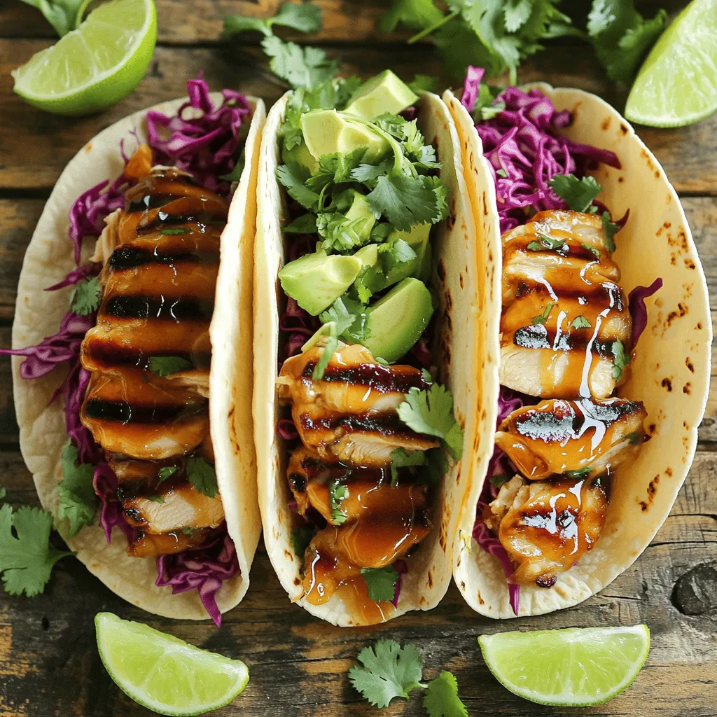 Next up, it’s taco time! Warm your corn tortillas in a dry skillet over medium heat for about 30 seconds on each side. This makes them soft and easy to fold. For each tortilla, layer a few strips of grilled chicken. Then, add a handful of shredded red cabbage and slices of avocado on top. Don’t forget to garnish with fresh cilantro. Serve your tacos with lime wedges on the side for a zesty kick.