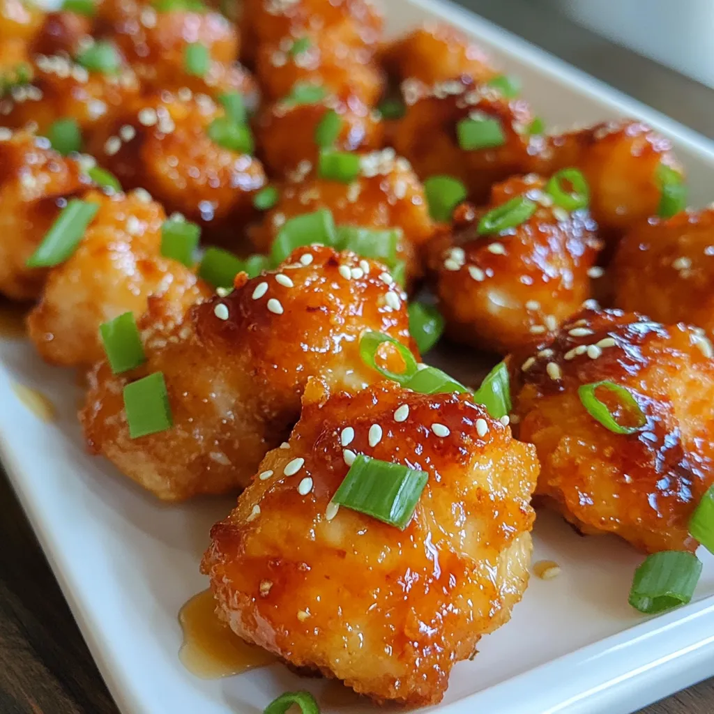 - Remove from heat. Transfer the glazed chicken bites to a serving platter and garnish with chopped green onions and a sprinkle of sesame seeds.