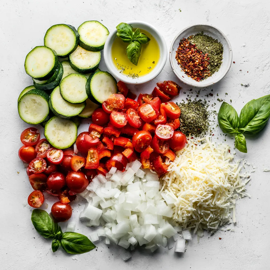 - In a large bowl, combine sliced zucchinis, cherry tomatoes, red bell pepper, onion, and minced garlic. Drizzle with olive oil, and season with oregano, basil, crushed red pepper flakes, salt, and pepper. Toss to coat the vegetables evenly.