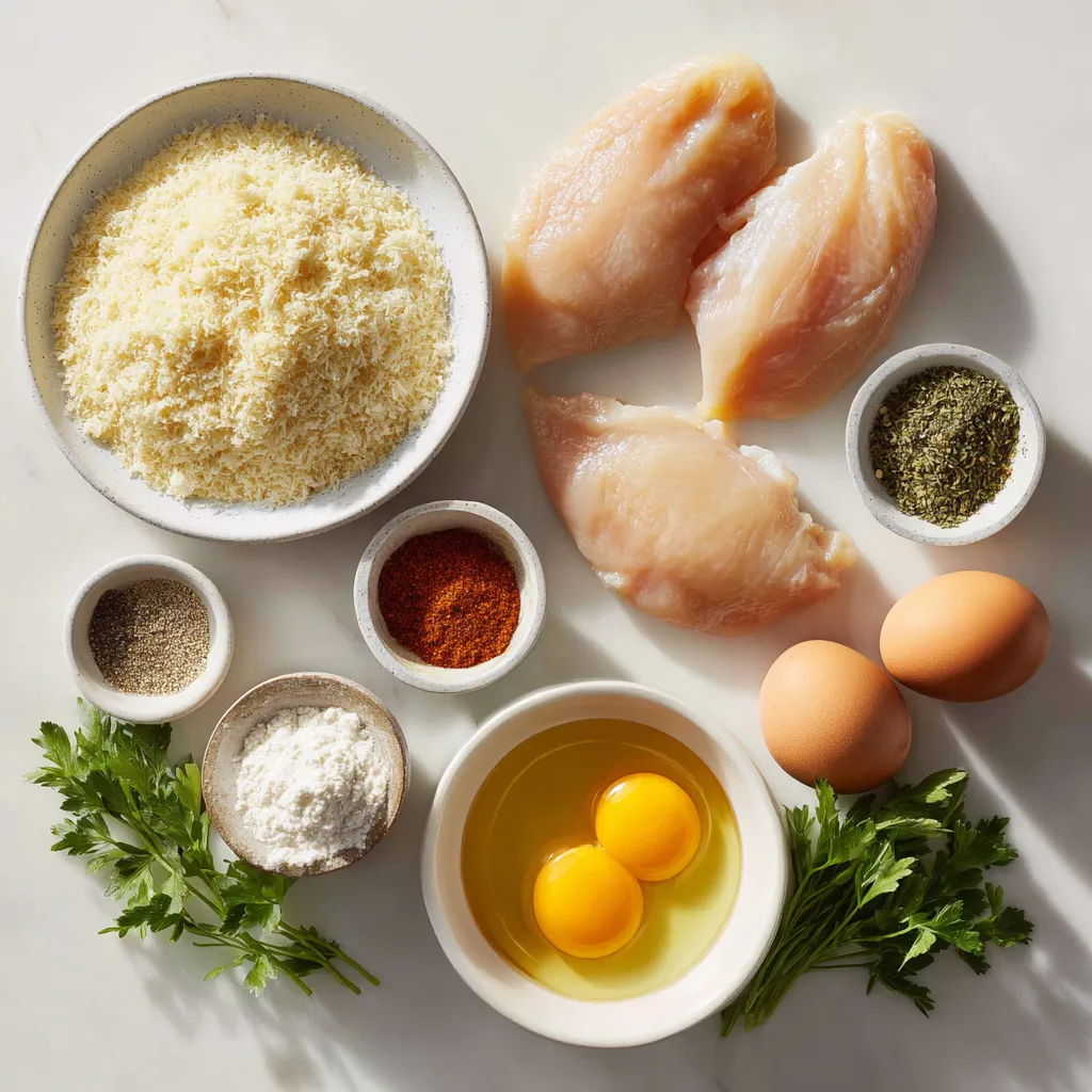 To start, gather all your ingredients. You need four chicken breasts, Parmesan cheese, and panko breadcrumbs. Also, have garlic powder, onion powder, oregano, paprika, salt, and pepper ready. You'll use eggs and Dijon mustard for coating. Finally, get some flour for dredging.