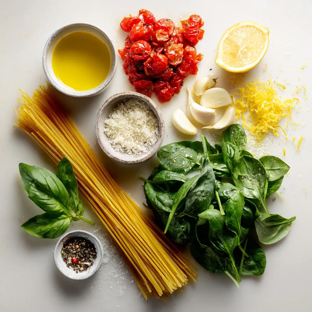 When I gather these ingredients, I feel ready to create something special. Each item plays a big role in the dish's flavor. The spaghetti or linguine forms the base. Olive oil adds richness. Garlic and chili bring warmth and depth. Cherry tomatoes create a fresh, tangy sauce. Baby spinach adds color and nutrition.