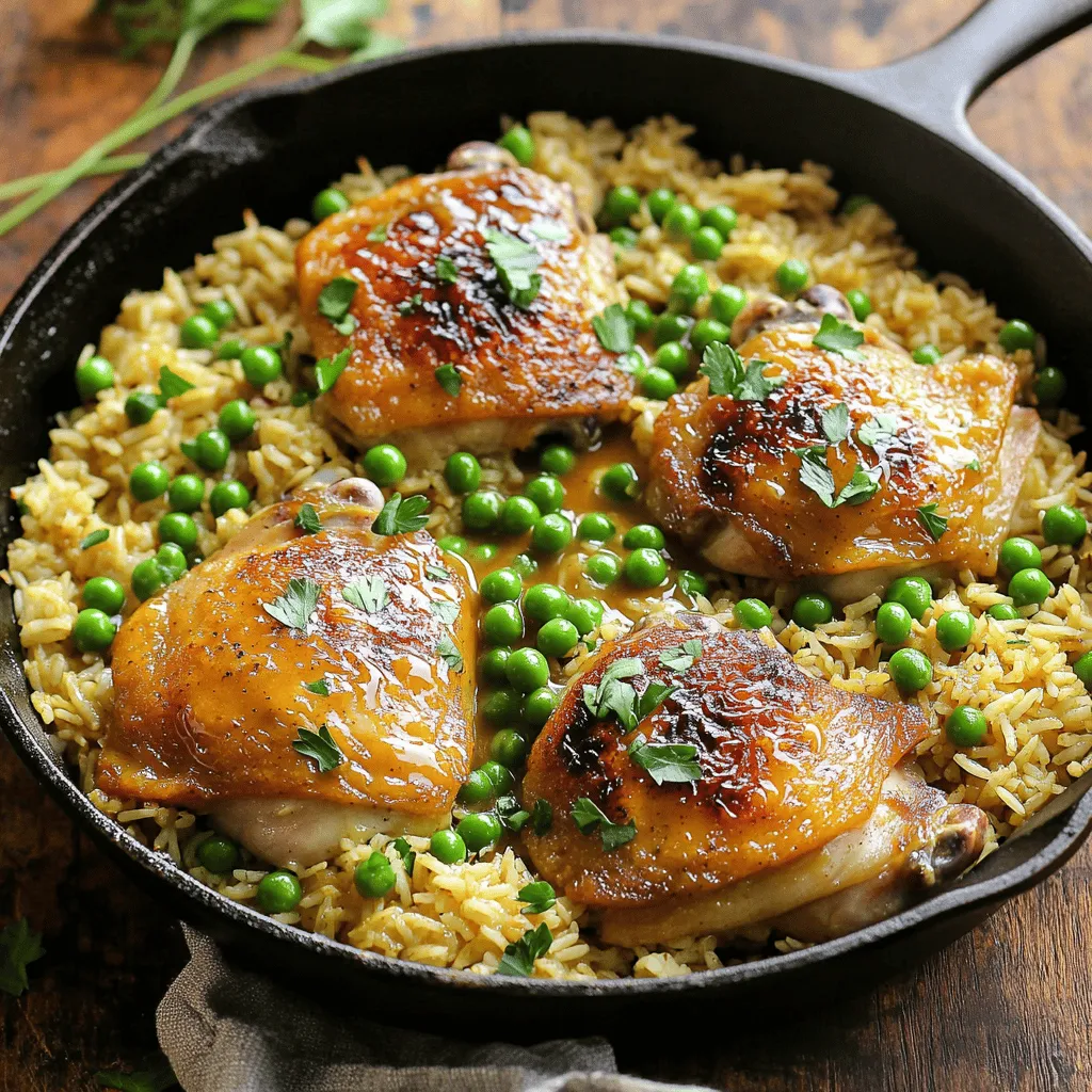 Cover the skillet with a lid or foil. Place it in the preheated oven at 375°F (190°C). Bake for 25 to 30 minutes. Check that the rice is tender and the chicken is cooked through. After baking, take the skillet out of the oven. Stir in 1 cup of frozen peas. Cover again and let it sit for 5 minutes. This allows the peas to heat through. Finally, fluff the rice with a fork. Drizzle the remaining honey mustard sauce over everything and sprinkle with chopped parsley before serving.