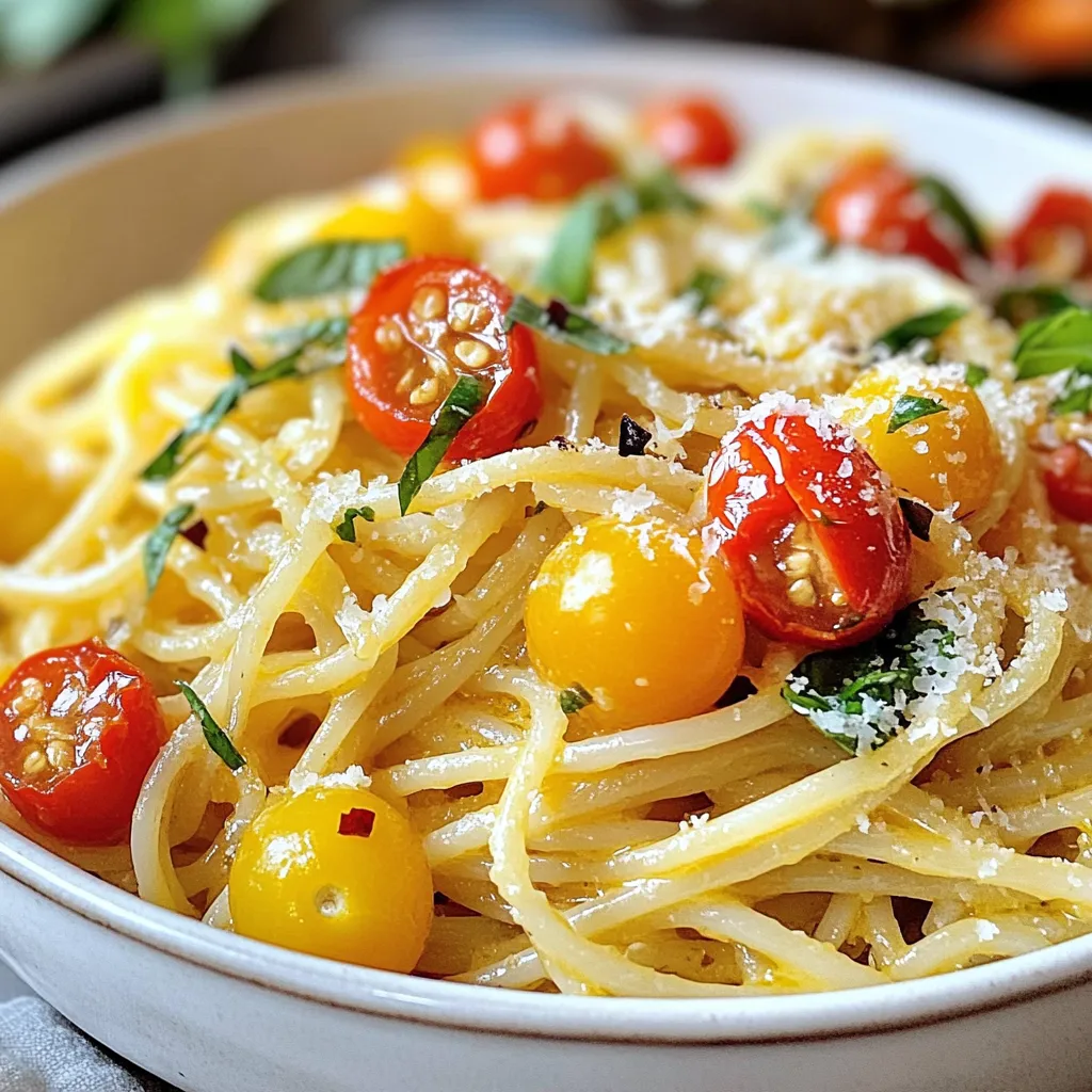 - Add the spaghetti and cherry tomatoes to the pot, stirring to combine.