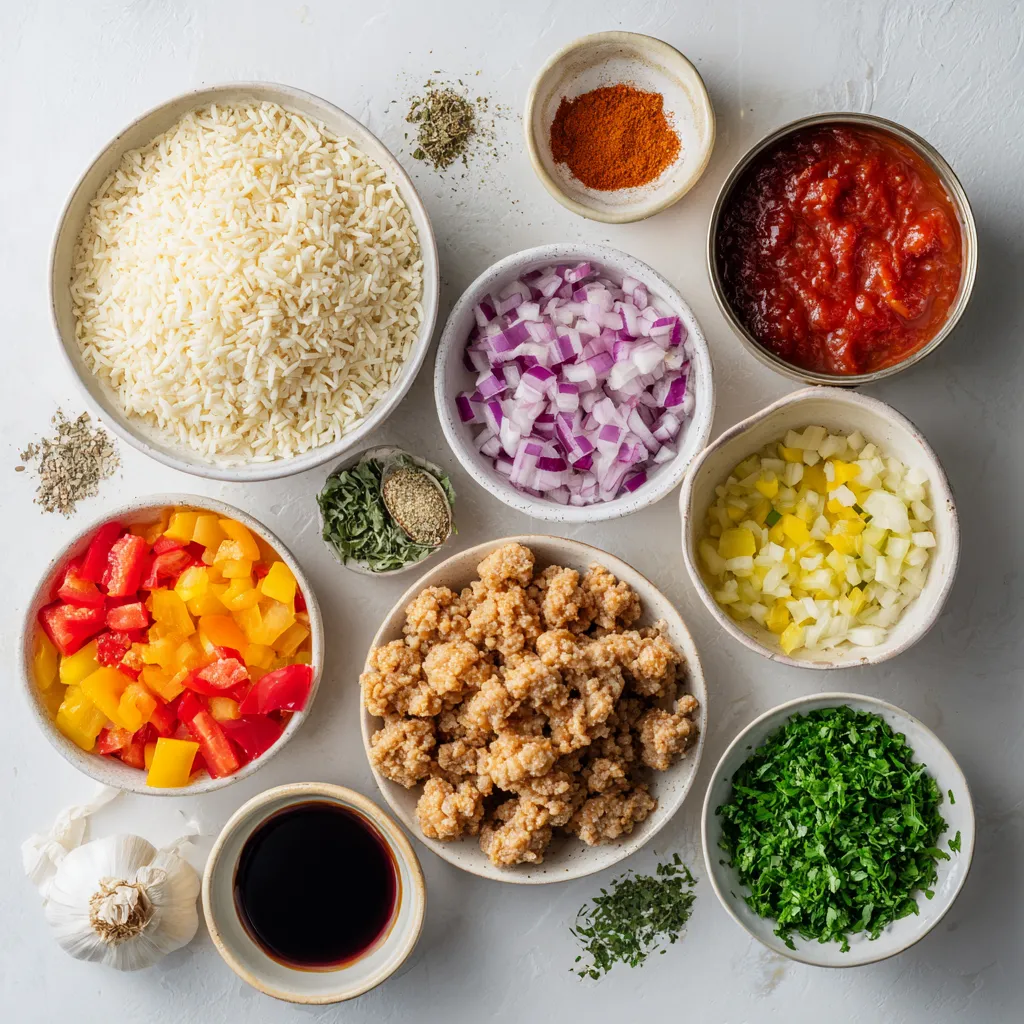 The main ingredients create a balanced dish. The Italian sausage adds rich flavor and protein. The long-grain rice absorbs all the tasty juices. Diced onion, garlic, and bell pepper bring color and sweetness. Diced tomatoes with chili add a nice kick. Chicken broth ties everything together with a savory base.