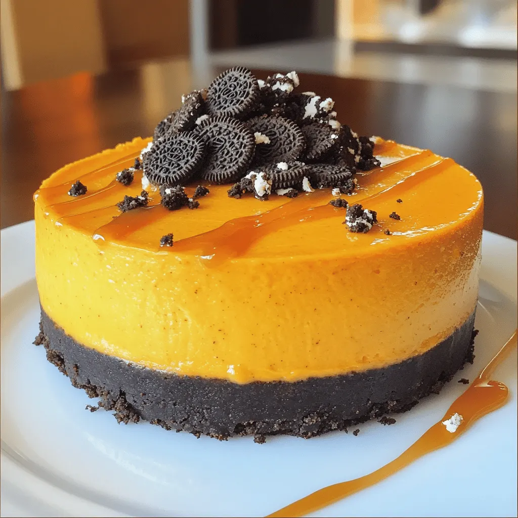 ![To make the Oreo pumpkin cheesecake, you need these simple ingredients: - 1 ½ cups Oreo cookie crumbs - 4 tablespoons unsalted butter, melted - 16 oz cream cheese, softened - 1 cup canned pumpkin puree - 1 cup sugar - 1 teaspoon vanilla extract - 2 large eggs - 1 teaspoon ground cinnamon - ½ teaspoon ground nutmeg - ¼ teaspoon ground ginger - ½ cup sour cream - Extra Oreo cookies for garnish (optional) These ingredients work together to create a creamy and flavorful cheesecake. The Oreo cookie crumbs give the crust a delicious, rich taste. Using cream cheese and pumpkin puree makes it smooth and light. The spices like cinnamon, nutmeg, and ginger add warmth, perfect for fall. I love how easy this recipe is. You can find all these ingredients at your local grocery store. Just remember to pick up some extra Oreos if you want to garnish your cheesecake. Trust me, it’s worth it! For the full recipe, check the link provided. Set your oven temperature to 325°F (163°C). This step is key for even baking. In a medium bowl, mix 1 ½ cups of Oreo cookie crumbs with 4 tablespoons of melted butter. Stir until the crumbs soak up the butter. Press this mixture into the bottom of a 9-inch springform pan. Make it firm and even. Bake the crust for 10 minutes, then let it cool. In a large bowl, beat 16 oz of softened cream cheese until it is smooth. This process makes the filling creamy. Then, mix in 1 cup of canned pumpkin puree and 1 cup of sugar until everything is well combined. Add 2 large eggs one at a time, mixing well after each. Next, include 1 teaspoon of ground cinnamon, ½ teaspoon of ground nutmeg, and ¼ teaspoon of ground ginger. Mix on low speed until just combined. Pour the pumpkin cheesecake filling over the cooled Oreo crust. Smooth the top with a spatula. Place it in the oven and bake for 50-60 minutes. Keep an eye on it; the center should still jiggle slightly when done. After baking, turn off the oven and leave the cheesecake inside for an hour. This gradual cooling helps prevent cracks. Once it cools down, refrigerate the cheesecake for at least 4 hours. For best results, chill it overnight. For the complete recipe, check out the Full Recipe section. - Monitor cake for slight jiggle: This helps ensure your cheesecake is creamy. When it has a slight jiggle in the center, it means it's still set properly. Don't overbake; a slight jiggle means it will firm up as it cools. - Use a water bath for more even cooking: This method helps the cheesecake cook gently. Fill a large pan with water and place it in the oven while baking. The steam keeps your cheesecake moist and prevents cracks. - Serve with caramel sauce: A drizzle of caramel adds sweetness and a beautiful look. Pour some on each plate before placing the cheesecake slice on top. - Sprinkle additional crushed Oreos: This adds texture and a fun look. Just crush some extra Oreos and sprinkle them on top for an appealing finish. - Perfect for holidays: This cheesecake shines at Thanksgiving or Halloween gatherings. Its flavors and look make it a crowd favorite. - Pair with coffee or chai: The rich flavors match well with warm drinks. Serve with a cup of coffee or chai for a delightful treat. For the full recipe, check out the detailed instructions to create this delicious dessert! {{image_2}} You can make your Oreo pumpkin cheesecake even better with a few add-ins. - Chocolate chips: Try adding chocolate chips to the filling for an extra layer of flavor. They melt and make each slice richer and more decadent. - Swirl in caramel or chocolate sauce: Drizzle some caramel or chocolate sauce into the cheesecake before baking. Use a knife to swirl it in, creating a beautiful pattern. This adds a sweet surprise in every bite. If you need a gluten-free version, it's easy to adapt. Simply substitute regular Oreo cookies with gluten-free Oreo cookies. The taste stays delicious, and everyone can enjoy this treat without worry. Want to switch things up? Here are some fun flavor ideas: - Add white chocolate: Mixing in white chocolate chips gives a rich and creamy taste. It pairs nicely with the pumpkin flavor. - Experiment with different spices: You can try other spices like allspice or cloves. Just a pinch can change the whole flavor profile. Get creative and find your favorite combo! For the full recipe, check out the [Full Recipe]. After baking your Oreo pumpkin cheesecake, let it cool completely. Then, store it in an airtight container. This way, it stays fresh for up to 5 days. Keeping it sealed helps prevent any odors from other foods in the fridge from affecting its taste. If you want to keep your cheesecake longer, freezing is a great option. First, slice the cheesecake into pieces. Wrap each slice tightly in plastic wrap. Place the wrapped slices in a freezer-safe bag or container. This method helps keep the cheesecake fresh for up to 3 months. When you are ready to enjoy, just take out a slice! To thaw your frozen cheesecake, take it out of the freezer and unwrap it. Place the slice in the fridge for several hours or overnight. This slow thawing process keeps the texture smooth and creamy. Avoid thawing at room temperature, as this can make the cheesecake soggy. Enjoy your delicious treat anytime! For the full recipe, check out the main article. Yes, you can use fresh pumpkin. Fresh pumpkin has a different taste and texture. To use it, roast the pumpkin until soft, then puree it. Make sure to drain excess water. This process takes more time than using canned pumpkin, but the flavor is often richer and fresher. Check the cheesecake by gently shaking the pan. The center should jiggle slightly, but the edges should be set. You can also insert a knife in the center. If it comes out mostly clean, it’s done. Remember, the cheesecake will firm up as it cools. If your cheesecake cracks, don’t worry! This can happen to anyone. To prevent cracks, avoid overbaking and let the cheesecake cool slowly in the oven. If cracks do occur, cover