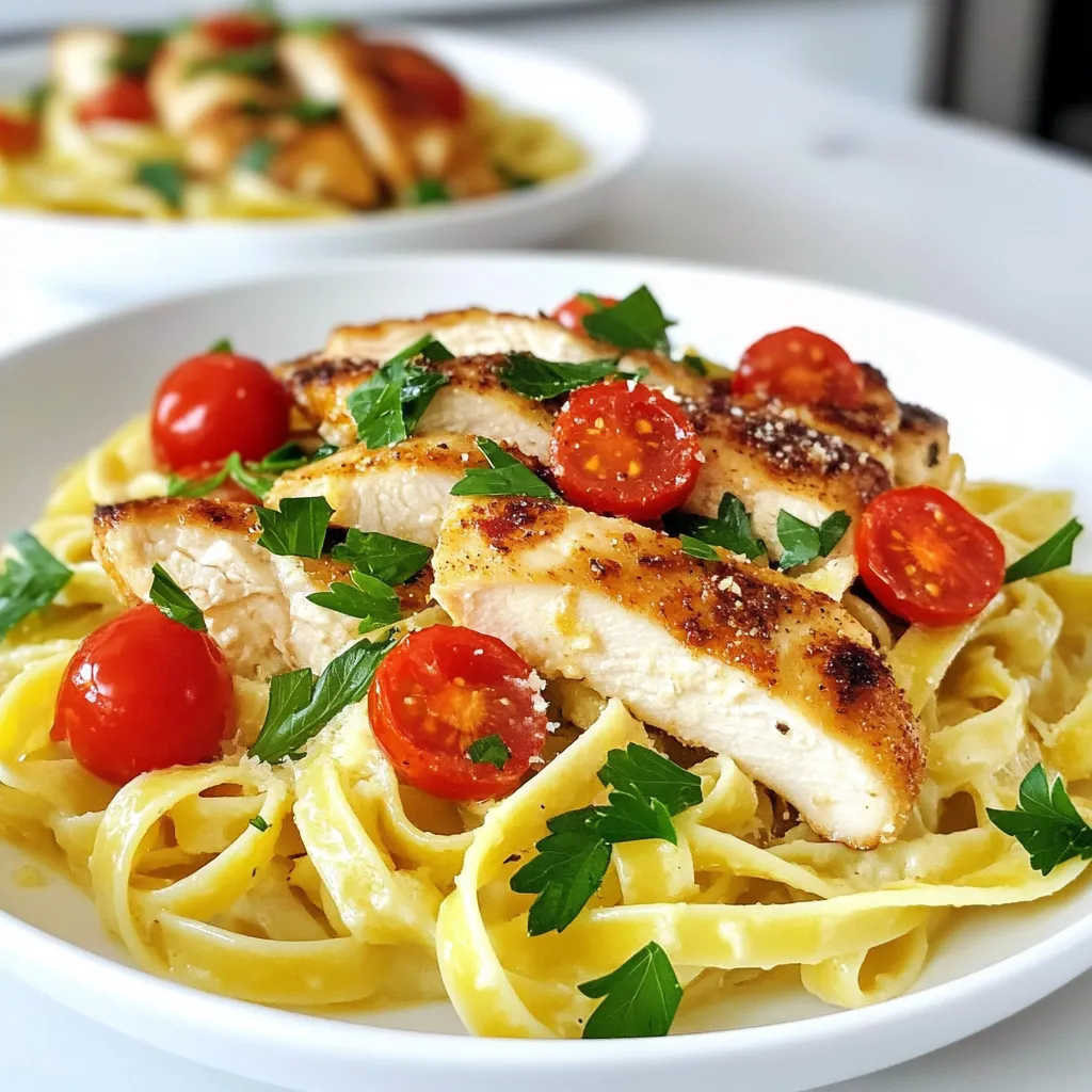 Add the cooked fettuccine to the skillet with the sauce. Toss it well to coat every piece of pasta. Now, add the sliced chicken to the mix. If you want, you can toss in halved cherry tomatoes for a fresh burst of flavor. Adjust the seasoning with salt and pepper if needed. Serve it right away, and don’t forget to garnish with fresh parsley!