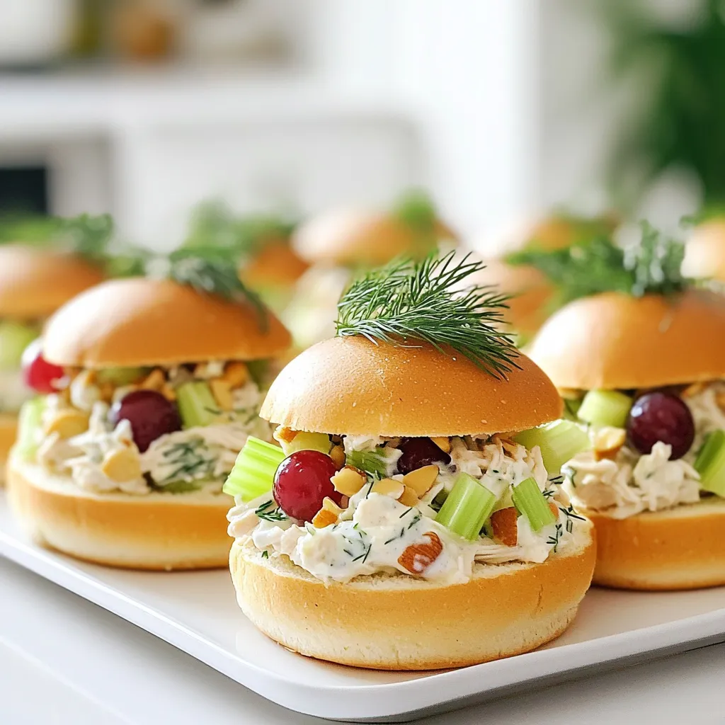 For add-ins, I love using diced celery. It adds a nice crunch. Halved red grapes bring a sweet touch to the salad. Chopped almonds give extra texture and nutty flavor. Mini slider buns hold everything together. Finally, I garnish with leafy greens. They add freshness and make the sliders look pretty.